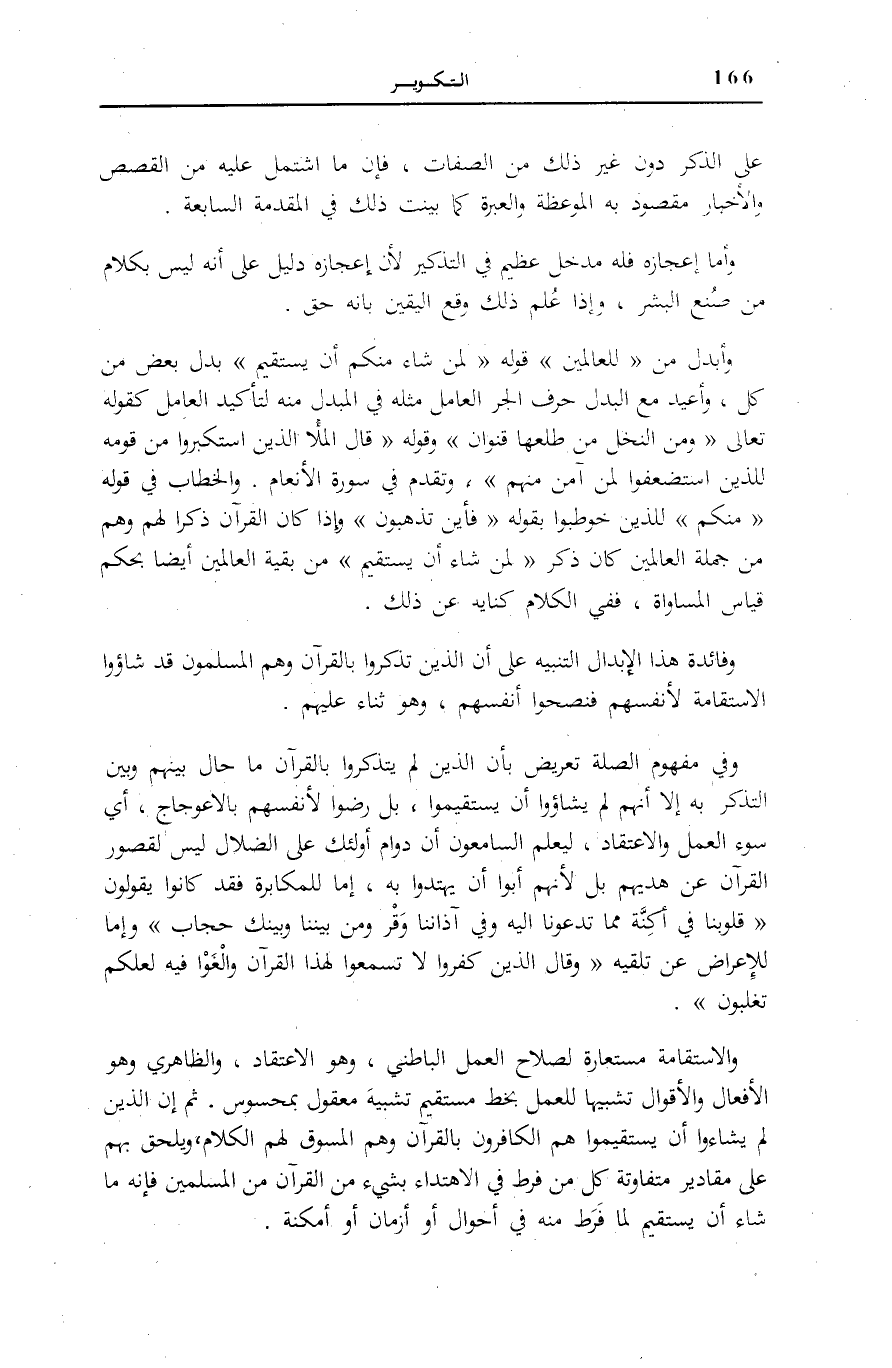 عَلَى الذِّكْرِ دُونَ غَيْرِ ذَلِكَ مِنَ الصِّفَاتِ، فَإِنَّ مَا اشْتَمَلَ عَلَيْهِ مِنَ الْقِصَصِ وَالْأَخْبَارِ مَقْصُودٌ بِهِ الْمَوْعِظَةُ وَالْعِبْرَةُ كَمَا بَيَّنْتُ ذَلِكَ فِي الْمُقَدِّمَةِ السَّابِعَةِ.