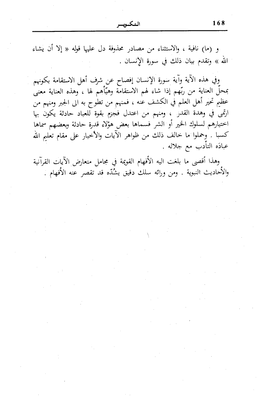 وَهَذَا أَقْصَى مَا بَلَغَتْ إِلَيْهِ الْأَفْهَامُ الْقَوِيمَةُ فِي مَجَامِلِ مُتَعَارِضِ الْآيَاتِ الْقُرْآنِيَّةِ وَالْأَحَادِيثِ النَّبَوِيَّةِ. وَمِنْ وَرَائِهِ سِلْكٌ دَقِيقٌ يَشُدُّهُ قَدْ تَقْصُرُ عَنْهُ الْأَفْهَامُ.
