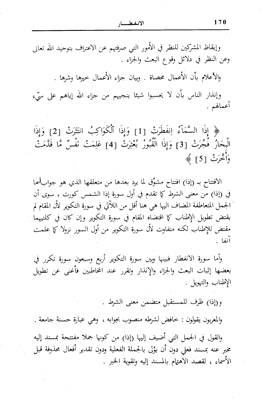 إِذَا السَّماءُ انْفَطَرَتْ (1) وَإِذَا الْكَواكِبُ انْتَثَرَتْ (2) وَإِذَا الْبِحارُ فُجِّرَتْ (3) وَإِذَا الْقُبُورُ بُعْثِرَتْ (4)