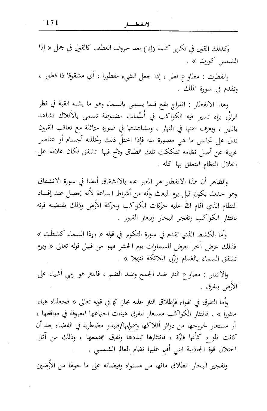 وَأَمَّا التَّفَرُّقُ فِي الْهَوَاءِ فَإِطْلَاقُ النَّثْرِ عَلَيْهِ مَجَازٌ كَمَا فِي قَوْلِهِ تَعَالَى: فَجَعَلْناهُ هَباءً مَنْثُوراً [الْفرْقَان: 23] . فَانْتِثَارُ الْكَوَاكِبِ مُسْتَعَارٌ لِتَفَرُّقِ هَيْئَاتِ اجْتِمَاعِهَا الْمَعْرُوفَةِ فِي مَوَاقِعِهَا، أَوْ مُسْتَعَارٌ لِخُرُوجِهَا مِنْ دَوَائِرِ أَفْلَاكِهَا وَسُمُوتِهَا فَتَبْدُو مُضْطَرِبَةً فِي الْفَضَاءِ بَعْدَ أَنْ كَانَتْ تَلُوحُ كَأَنَّهَا قَارَّةٌ، فَانْتِثَارُهَا تَبَدُّدُهَا وَتَفَرُّقُ مُجْتَمَعِهَا، وَذَلِكَ مِنْ آثَارِ اخْتِلَالِ قُوَّةِ الْجَاذِبِيَّةِ الَّتِي أُقِيمَ عَلَيْهَا نِظَامُ الْعَالَمِ الشَّمْسِيُّ.
