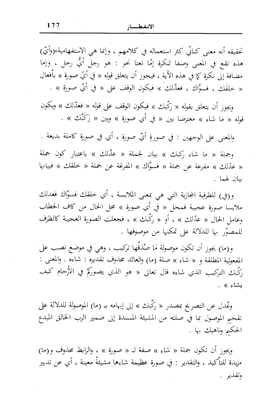تَحْقِيقُهُ أَنَّهُ مَعْنًى كِنَائِيٌّ كَثُرَ اسْتِعْمَالُهُ فِي كَلَامِهِمْ، وَإِنَّمَا هِيَ الِاسْتِفْهَامِيَّةُ، وأَيِّ هَذِهِ تَقَعُ فِي الْمَعْنَى وَصْفًا لِنَكِرَةٍ إِمَّا نَعْتًا نَحْوَ: هُوَ رَجُلٌ أَيُّ رَجُلٍ، وَإِمَّا مُضَافَةً إِلَى نَكِرَةٍ كَمَا فِي هَذِهِ الْآيَةِ، فَيَجُوزُ أَنْ يَتَعَلَّقَ قَوْلُهُ: فِي أَيِّ صُورَةٍ بِأَفْعَالِ خَلَقَكَ، فَسَوَّاكَ، فَعَدَّلَكَ» فَيَكُونُ الْوَقْفُ عَلَى فِي أَيِّ صُورَةٍ وَيَجُوزُ أَنْ يَتَعَلَّقَ بِقَوْلِهِ رَكَّبَكَ فَيَكُونُ الْوَقْفُ عَلَى قَوْلِهِ فَعَدَلَكَ وَيَكُونُ قَوْلُهُ مَا شاءَ مُعْتَرِضًا بَيْنَ فِي أَيِّ صُورَةٍ وَبَيْنَ رَكَّبَكَ وَالْمَعْنَى عَلَى الْوَجْهَيْنِ: فِي صُورَةٍ أَيِّ صُورَةٍ، أَيْ فِي صُورَةٍ كَامِلَةٍ بَدِيعَةٍ.