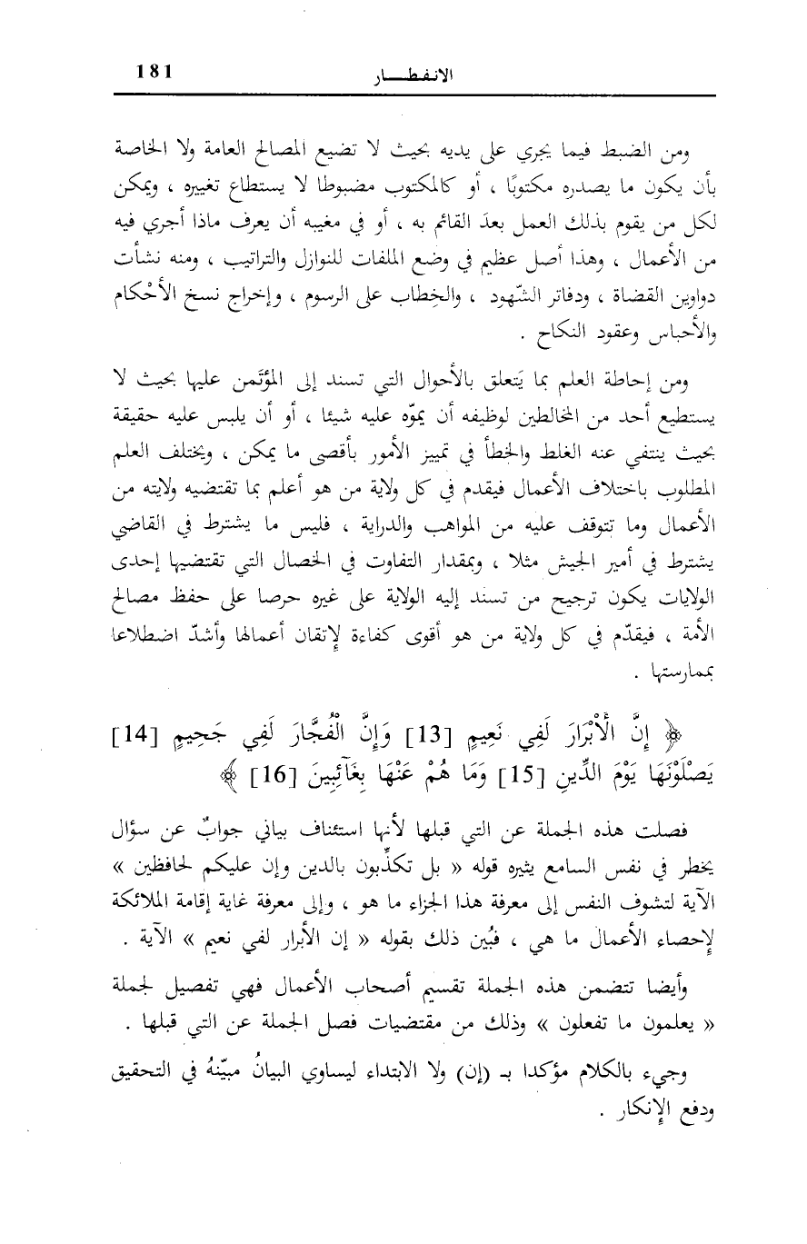 فُصِلَتْ هَذِهِ الْجُمْلَةُ عَنِ الَّتِي قَبْلَهَا لِأَنَّهَا اسْتِئْنَافٌ بَيَانِيٌّ جَوَابٌ عَنْ سُؤَالٍ يَخْطُرُ فِي نَفْسِ السَّامِعِ يُثِيرُهُ قَوْلُهُ: بَلْ تُكَذِّبُونَ بِالدِّينِ وَإِنَّ عَلَيْكُمْ لَحافِظِينَ [الانفطار: 9، 10] الْآيَةَ لِتَشَوُّفِ النَّفْسِ إِلَى مَعْرِفَةِ هَذَا الْجَزَاءِ مَا هُوَ، وَإِلَى مَعْرِفَةِ غَايَةِ إِقَامَةِ الْمَلَائِكَةِ لِإِحْصَاءِ الْأَعْمَالِ مَا هِيَ، فَبُيِّنَ ذَلِكَ بِقَوْلِهِ: إِنَّ الْأَبْرارَ لَفِي نَعِيمٍ الْآيَةَ.