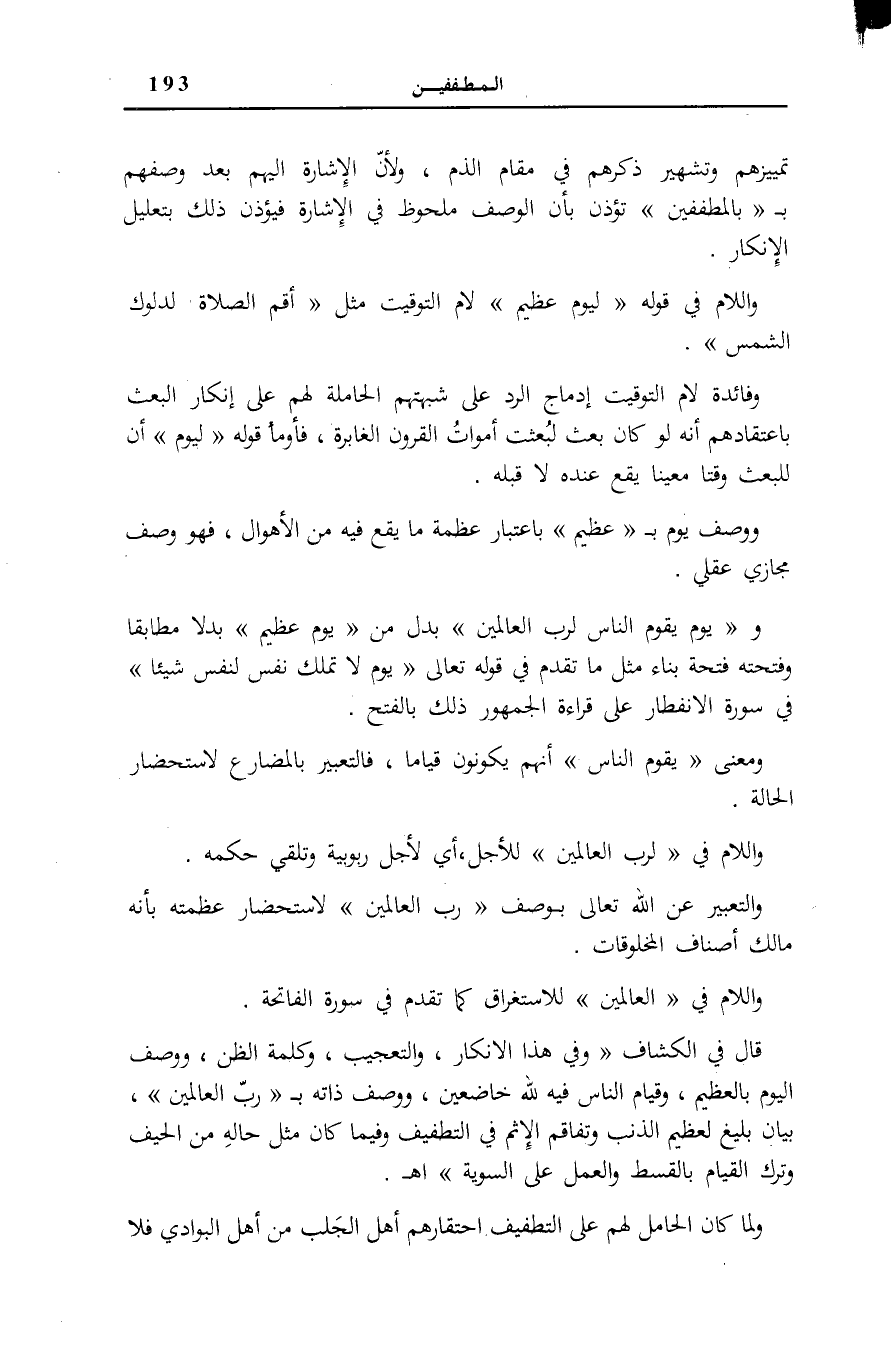 قَالَ فِي «الْكَشَّافِ» «وَفِي هَذَا الْإِنْكَارِ، وَالتَّعْجِيبِ، وَكَلِمَةِ الظَّنِّ، وَوَصْفِ الْيَوْمِ بِالْعَظِيمِ، وَقِيَامِ النَّاس فِيهِ الله خَاضِعِينَ، وَوَصْفِ ذَاتِهِ بِ «رَبِّ الْعَالَمِينَ» بَيَانٌ بَلِيغٌ لِعَظِيمِ الذَّنْبِ وَتَفَاقُمِ الْإِثْمِ فِي التَّطْفِيفِ وَفِيمَا كَانَ مِثْلُ حَالِهِ مِنَ الْحَيْفِ وَتَرْكِ الْقِيَامِ بِالْقِسْطِ وَالْعَمَلِ عَلَى السَّوِيَّةِ» اهـ.