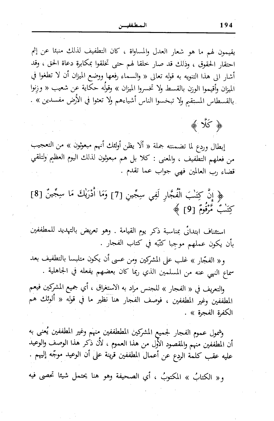 إِنَّ كِتابَ الفُجَّارِ لَفِي سِجِّينٍ (7) وَما أَدْراكَ مَا سِجِّينٌ (8) كِتابٌ مَرْقُومٌ اسْتِئْنَافٌ ابْتِدَائِيٌّ بِمُنَاسَبَةِ ذِكْرِ يَوْمِ الْقِيَامَةِ. وَهُوَ تَعْرِيضٌ بِالتَّهْدِيدِ لِلْمُطَفِّفِينَ بِأَنْ يَكُونَ عَمَلُهُمْ مُوجِبًا كَتْبَهُ فِي كِتَابِ الْفُجَّارِ.