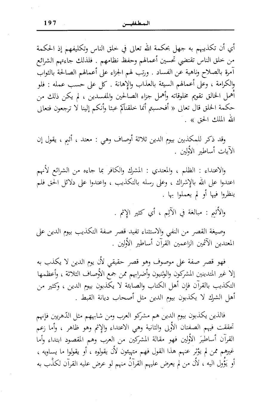 وَصِيغَةُ الْقَصْرِ مِنَ النَّفْيِ وَالِاسْتِثْنَاءِ تُفِيدُ قَصْرَ صِفَةِ التَّكْذِيبِ بِيَوْمِ الدِّينِ عَلَى الْمُعْتَدِينَ الْآثِمِينَ الزَّاعِمِينَ الْقُرْآنَ أَسَاطِيرَ الْأَوَّلِينَ.