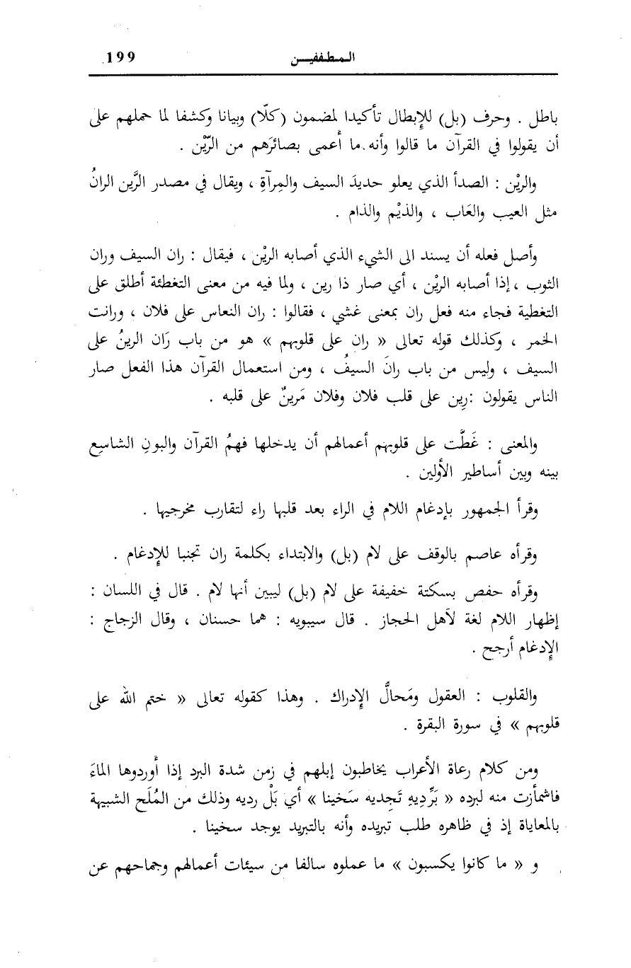 وَالْمَعْنَى: غَطَّتْ عَلَى قُلُوبِهِمْ أَعْمَالُهُمْ أَنْ يَدْخُلَهَا فَهْمُ الْقُرْآنِ وَالْبَوْنُ الشَّاسِعُ بَيْنَهُ وَبَيْنَ أَسَاطِيرِ الْأَوَّلِينَ.