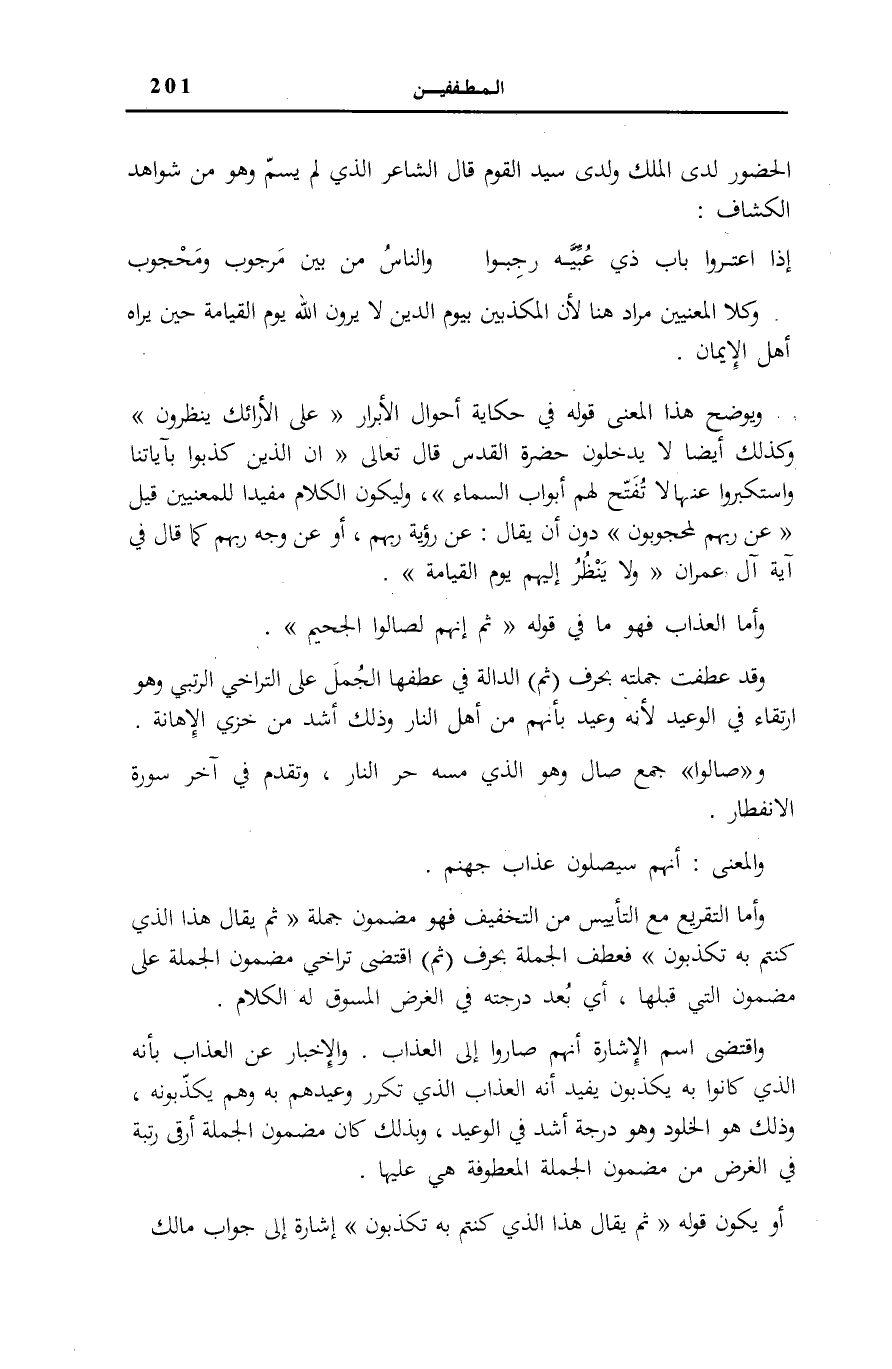 وَيُوَضِّحُ هَذَا الْمَعْنَى قَوْلُهُ فِي حِكَايَةِ أَحْوَالِ الْأَبْرَارِ: عَلَى الْأَرائِكِ يَنْظُرُونَ [المطففين: 23] وَكَذَلِكَ أَيْضًا لَا يَدْخُلُونَ حَضْرَةَ الْقُدُسِ قَالَ تَعَالَى: إِنَّ الَّذِينَ كَذَّبُوا بِآياتِنا وَاسْتَكْبَرُوا عَنْها لَا تُفَتَّحُ لَهُمْ أَبْوابُ السَّماءِ [الْأَعْرَاف: 40] ، وَلِيَكُونَ الْكَلَامُ مُفِيدًا لِلْمَعْنَيَيْنِ قِيلَ: «عَنْ رَبِّهِمْ لَمَحْجُوبُونَ» دُونَ أَنْ يُقَالَ: عَنْ رُؤْيَةِ رَبِّهِمْ، أَوْ عَنْ وَجْهِ رَبِّهِمْ كَمَا قَالَ فِي آيَةِ آلِ عِمْرَانَ [77] : وَلا يَنْظُرُ إِلَيْهِمْ يَوْمَ الْقِيامَةِ وَأَمَّا الْعَذَابُ فَهُوَ مَا فِي قَوْلِهِ: ثُمَّ إِنَّهُمْ لَصالُوا الْجَحِيمِ وَقَدْ عُطِفَتْ جُمْلَتُهُ بِحَرْفِ ثُمَّ الدَّالَّةِ فِي عَطْفِهَا الْجُمَلَ عَلَى التَّرَاخِي الرُّتْبِيِّ وَهُوَ