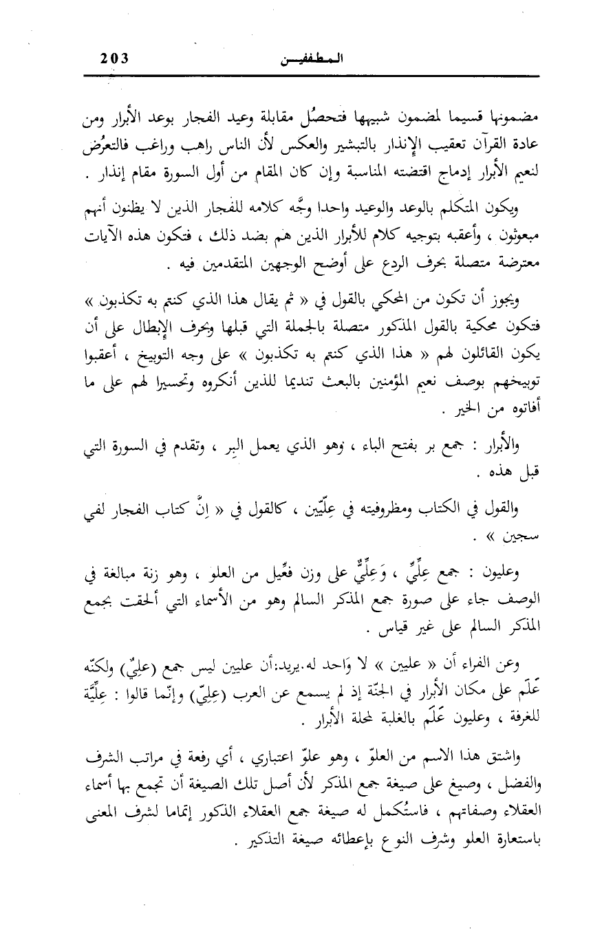 وَالْقَوْلُ فِي الْكِتَابِ وَمَظْرُوفِيَّتِهِ فِي عِلِّيِّينَ، كَالْقَوْلِ فِي إِنَّ كِتابَ الفُجَّارِ لَفِي سِجِّينٍ [المطففين: 7] .