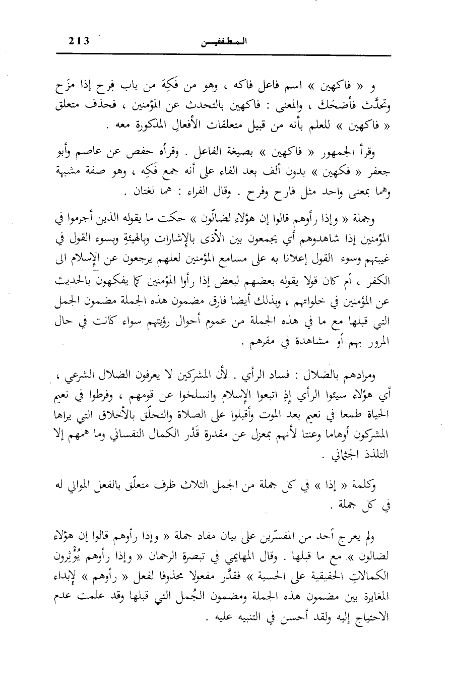 وَلَمْ يُعَرِّجْ أَحَدٌ مِنَ الْمُفَسِّرِينَ عَلَى بَيَانِ مُفَادِ جُمْلَةِ: وَإِذا رَأَوْهُمْ قالُوا إِنَّ هؤُلاءِ لَضالُّونَ مَعَ مَا قَبْلَهَا. وَقَالَ الْمَهَايِمِيُّ فِي «تبصرة الرحمان» : «وَإِذَا رَأَوْهُمْ يُؤْثِرُونَ الْكَمَالَاتِ الْحَقِيقِيَّةَ عَلَى الْحِسِّيَّةِ» فَقَدَّرَ مَفْعُولًا مَحْذُوفًا لِفِعْلِ رَأَوْهُمْ لِإِبْدَاءِ الْمُغَايَرَةِ بَيْنَ مَضْمُونِ هَذِهِ الْجُمْلَةِ وَمَضْمُونِ الْجُمَلِ الَّتِي قَبْلَهَا وَقَدْ عَلِمْتَ عَدَمَ الِاحْتِيَاجِ إِلَيْهِ وَلَقَدْ أَحْسَنَ