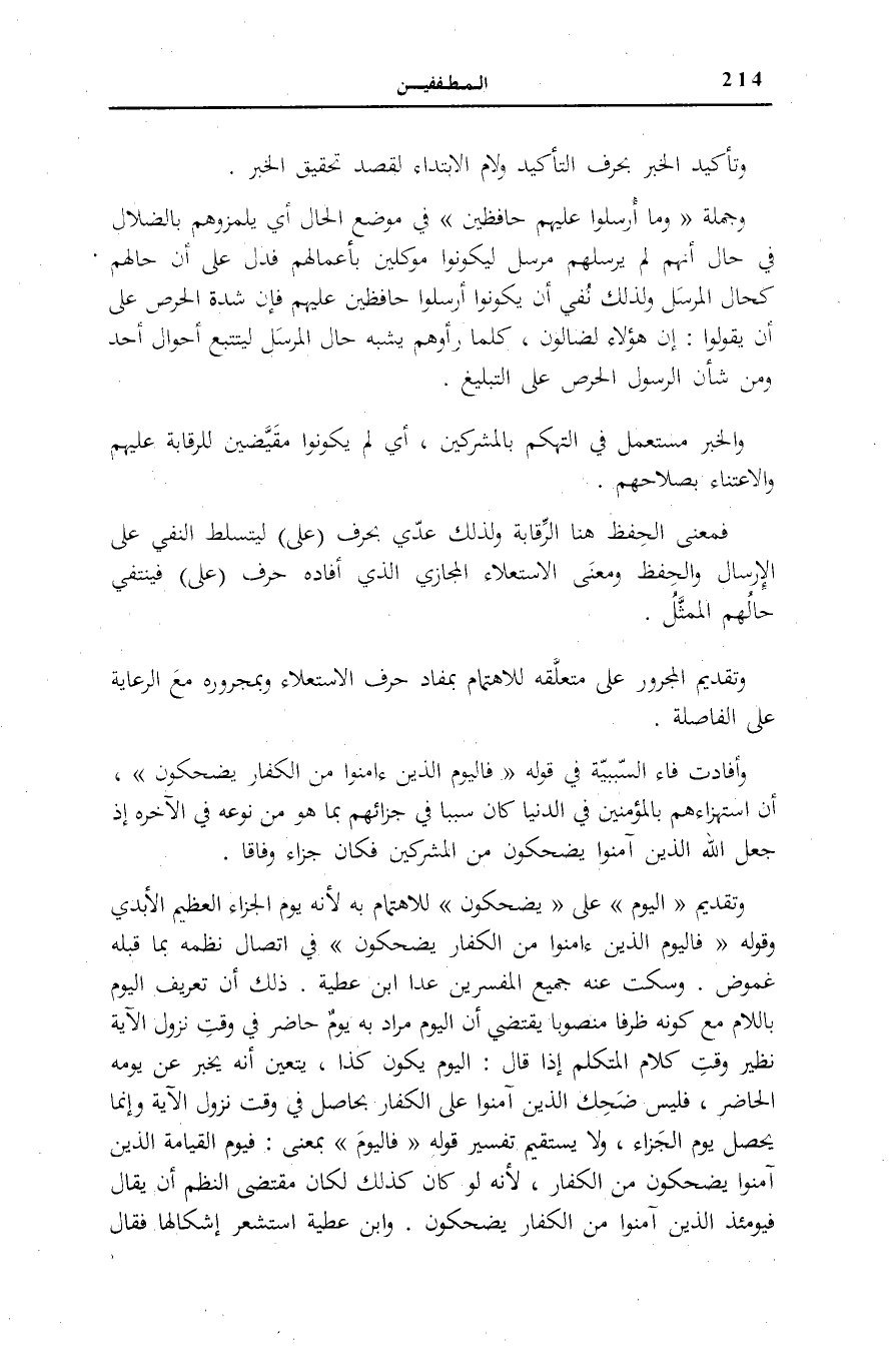 وَجُمْلَةُ: وَما أُرْسِلُوا عَلَيْهِمْ حافِظِينَ فِي مَوْضِعِ الْحَالِ أَيْ يَلْمِزُوهُمْ بِالضَّلَالِ فِي حَالِ أَنَّهُمْ لَمْ يُرْسِلْهُمْ مُرْسَلٌ لِيَكُونُوا مُوَكَّلِينَ بِأَعْمَالِهِمْ فَدَلَّ عَلَى أَنَّ حَالَهُمْ كَحَالِ الْمُرْسَلِ وَلِذَلِكَ نُفِيَ أَنْ يَكُونُوا أُرْسِلُوا حَافِظِينَ عَلَيْهِمْ فَإِنَّ شِدَّةَ الْحِرْصِ عَلَى أَنْ يَقُولُوا: إِنَّ هَؤُلَاءِ لَضَالُّونَ، كُلَّمَا رَأَوْهُمْ يُشْبِهُ حَالَ الْمُرْسَلِ لِيَتَتَبَّعَ أَحْوَالَ أَحَدٍ وَمِنْ شَأْنِ الرَّسُولِ الْحِرْصُ عَلَى التَّبْلِيغِ.
