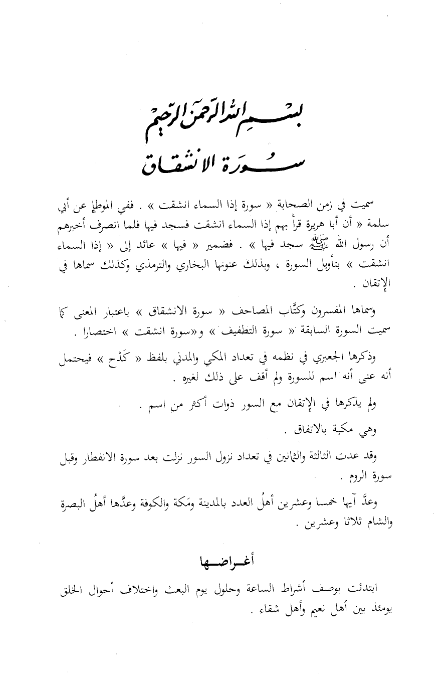 وسماها الْمُفَسِّرُونَ وَكُتَّابُ الْمَصَاحِفِ «سُورَةَ الِانْشِقَاقِ» بِاعْتِبَارِ الْمَعْنَى كَمَا سُمِّيَتِ السُّورَةُ السَّابِقَةُ «سُورَةَ التَّطْفِيفِ» وَ «سُورَةَ انْشَقَّتْ» اخْتِصَارًا.