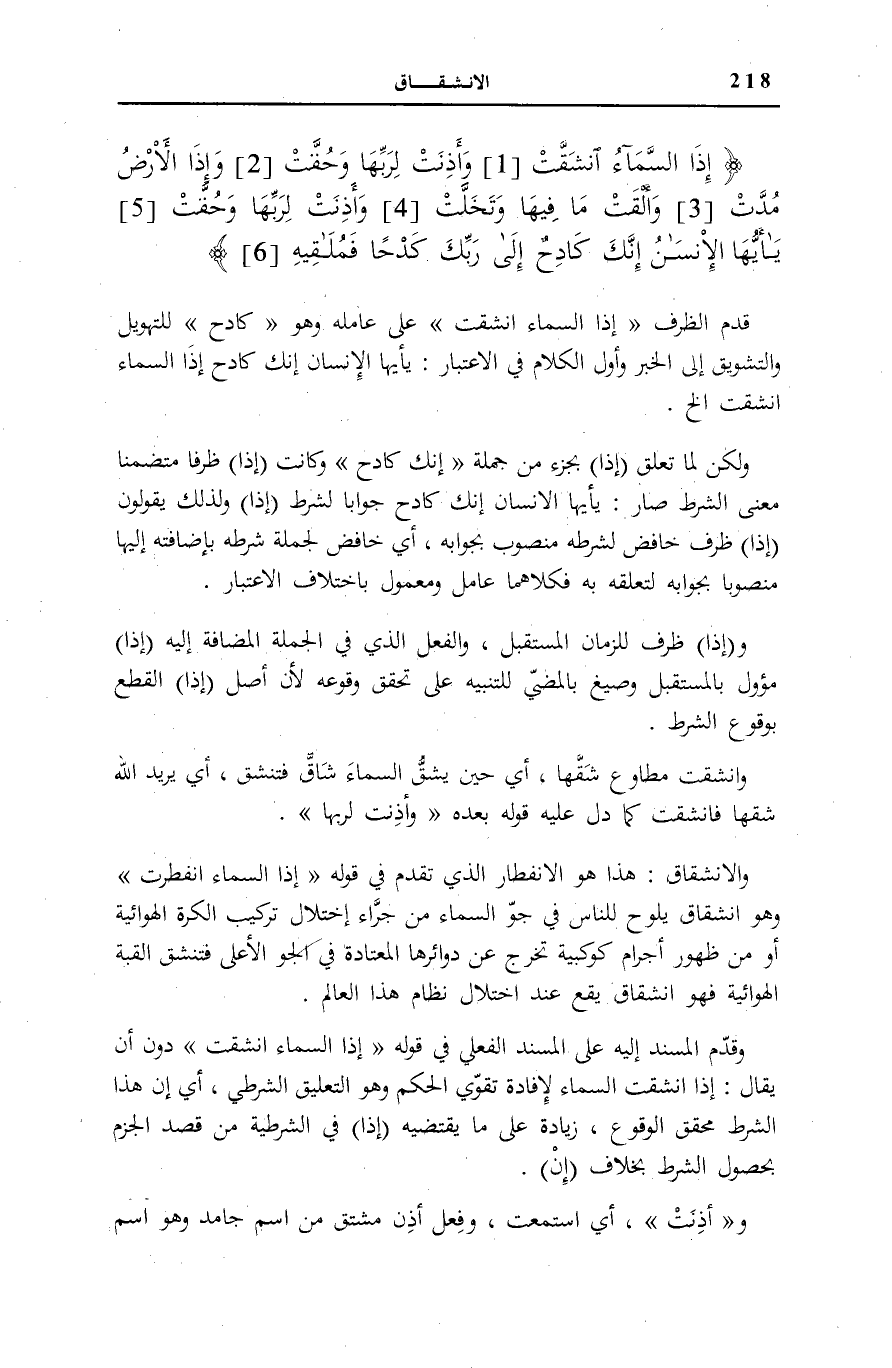 وَلَكِنْ لَمَّا تَعَلَّقَ إِذَا بِجُزْءٍ مِنْ جُمْلَةِ إِنَّكَ كادِحٌ وَكَانَتْ إِذَا ظَرْفًا مُتَضَمِّنًا مَعْنَى الشَّرْطِ صَارَ: يَا أَيُّهَا الْإِنْسَانُ إِنَّكَ كَادِحٌ جَوَابًا لِشَرْطِ إِذَا وَلِذَلِكَ يَقُولُونَ إِذَا ظَرْفٌ خَافِضٌ لِشَرْطِهِ مَنْصُوبٌ بِجَوَابِهِ، أَيْ خَافِضٌ لِجُمْلَةِ شَرْطِهِ بِإِضَافَتِهِ إِلَيْهَا مَنْصُوبًا بِجَوَابِهِ لِتَعَلُّقِهِ بِهِ فَكِلَاهُمَا عَامِلٌ وَمَعْمُولٌ بِاخْتِلَافِ الِاعْتِبَارِ.