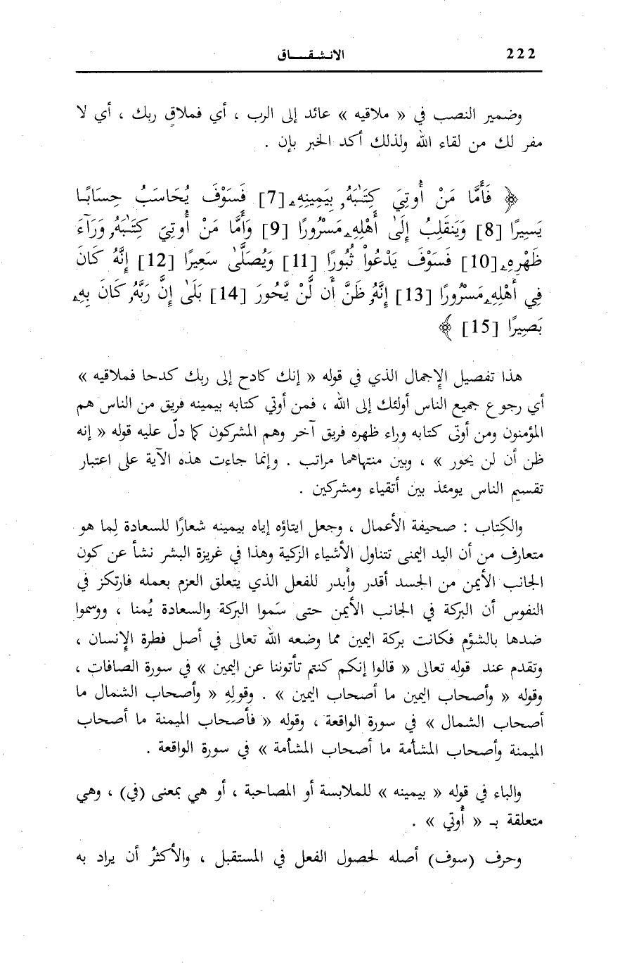 وَالْبَاءُ فِي قَوْلِهِ: بِيَمِينِهِ لِلْمُلَابَسَةِ أَوِ الْمُصَاحَبَةِ، أَوْ هِيَ بِمَعْنَى (فِي) ، وَهِيَ مُتَعَلِّقَةٌ بِ أُوتِيَ وَحَرْفُ (سَوْفَ) أَصْلُهُ لِحُصُولِ الْفِعْلِ فِي الْمُسْتَقْبَلِ، وَالْأَكْثَرُ أَنْ يُرَادَ بِهِ