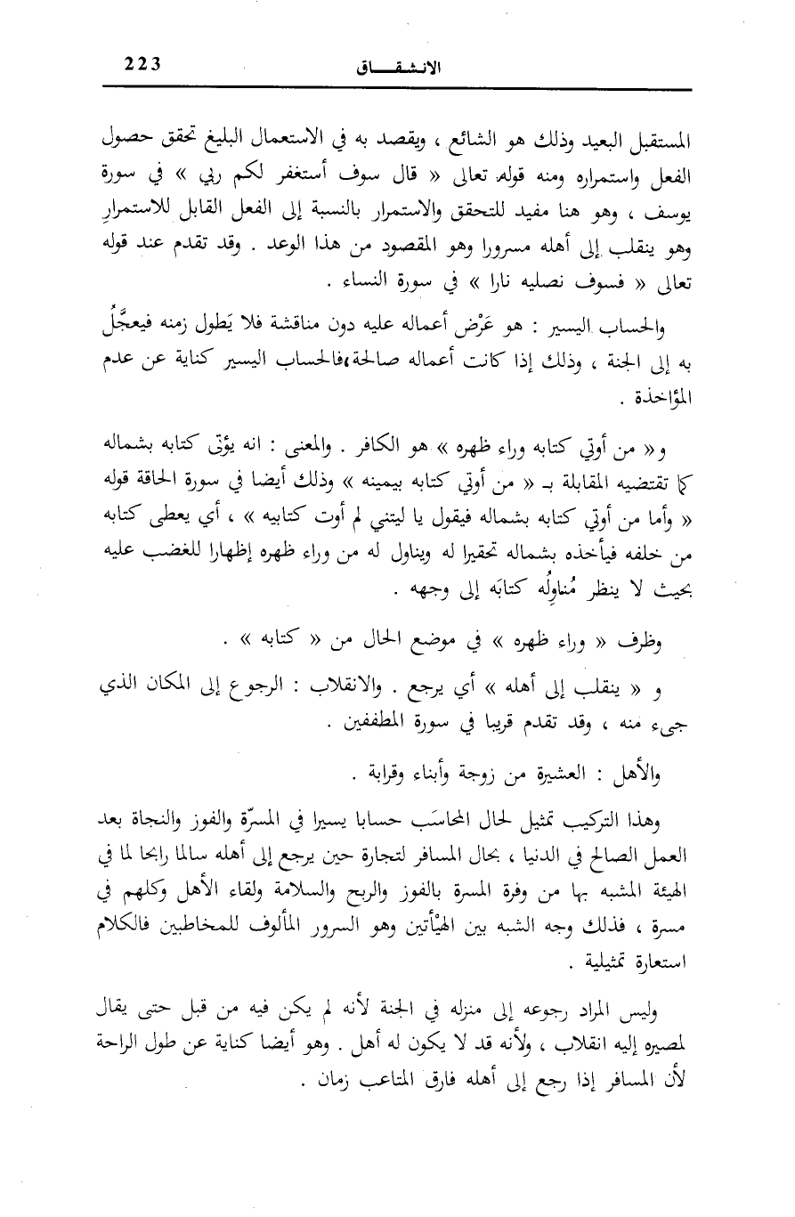 وَهَذَا التَّرْكِيبُ تَمْثِيلٌ لِحَالِ الْمُحَاسَبِ حِسَابًا يَسِيرًا فِي الْمَسَرَّةِ وَالْفَوْزِ وَالنَّجَاةِ بَعْدَ الْعَمَلِ الصَّالِحِ فِي الدُّنْيَا، بِحَالِ الْمُسَافِرِ لِتِجَارَةٍ حِينَ يَرْجِعُ إِلَى أَهْلِهِ سَالِمًا رَابِحًا لِمَا فِي الْهَيْئَةِ الْمُشَبَّهِ بِهَا مِنْ وَفْرَةِ الْمَسَرَّةِ بِالْفَوْزِ وَالرِّبْحِ وَالسَّلَامَةِ وَلِقَاءِ الْأَهْلِ وَكُلِّهِمْ فِي مَسَرَّةٍ، فَذَلِكَ وَجْهُ الشَّبَهِ بَيْنَ الْهَيْأَتَيْنِ وَهُوَ السُّرُورُ الْمَأْلُوفُ لِلْمُخَاطَبِينَ فَالْكَلَامُ اسْتِعَارَةٌ تَمْثِيلِيَّةٌ.