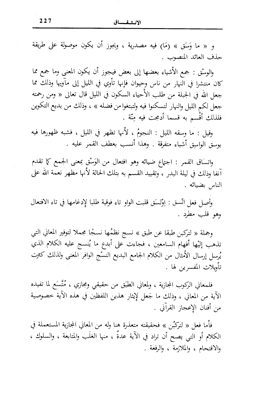 وَ (مَا وَسَقَ) (مَا) فِيهِ مَصْدَرِيَّةٌ، وَيَجُوزُ أَنْ يَكُونَ مَوْصُولَةً عَلَى طَرِيقَةِ حَذْفِ الْعَائِدِ الْمَنْصُوبِ.