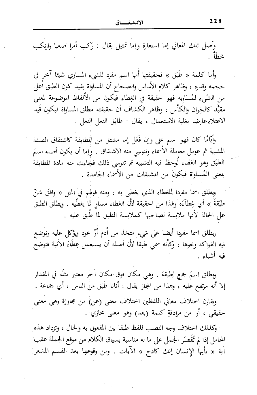 وَأَمَّا كَلِمَةُ طَبَقٍ فَحَقِيقَتُهَا أَنَّهَا اسْمٌ مُفْرَدٌ لِلشَّيْءِ الْمُسَاوِي شَيْئًا آخَرَ فِي حَجْمِهِ وَقَدْرِهِ، وَظَاهِرُ كَلَام «الأساس» و «الصِّحَاح» أَنَّ الْمُسَاوَاةَ بِقَيْدِ كَوْنِ الطَّبَقِ أَعْلَى مِنَ الشَّيْءِ لِمُسَاوِيهِ فَهُوَ حَقِيقَةٌ فِي الغطاء فَيكون من الْأَلْفَاظِ الْمَوْضُوعَةِ لِمَعْنًى مُقَيَّدٍ كَالْخِوَانِ وَالْكَأْسِ، وَظَاهِرُ «الْكَشَّافِ» أَنَّ حَقِيقَتَهُ مُطْلَقُ الْمُسَاوَاةِ فَيَكُونُ قَيْدُ الِاعْتِلَاءِ عَارِضًا بِغَلَبَةِ الِاسْتِعْمَالِ، يُقَالُ: طَابَقَ النَّعْل النَّعْل.