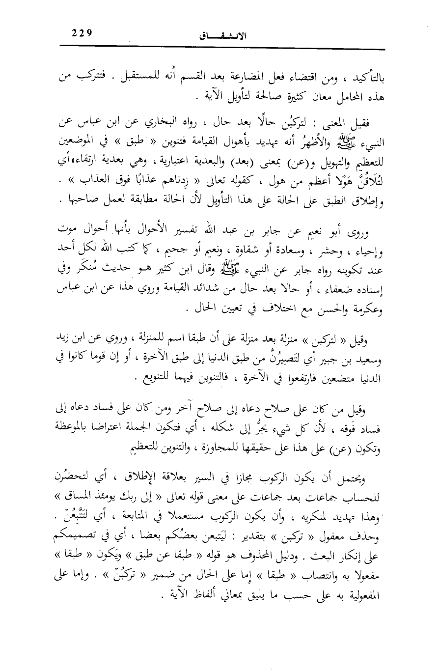 فَقِيلَ الْمَعْنَى: لَتَرْكَبُنَّ حَالًا بَعْدَ حَالٍ، رَوَاهُ الْبُخَارِيُّ عَنِ ابْنِ عَبَّاسٍ عَنِ النَّبِيءِ صَلَّى اللهُ عَلَيْهِ وَسَلَّمَ وَالْأَظْهَرُ أَنَّهُ تَهْدِيدٌ بِأَهْوَالِ الْقِيَامَةِ فَتَنْوِينُ «طَبَقٍ» فِي الْمَوْضِعَيْنِ لِلتَّعْظِيمِ وَالتَّهْوِيلِ وعَنْ بِمَعْنَى (بَعْدَ) وَالْبُعْدِيَّةُ اعْتِبَارِيَّةٌ، وَهِيَ بُعْدِيَّةُ ارْتِقَاءٍ، أَيْ لَتُلَاقُنَّ هَوْلًا أَعْظَمَ مِنْ هَوْلٍ، كَقَوْلِهِ تَعَالَى: زِدْناهُمْ عَذاباً فَوْقَ الْعَذابِ [النَّحْل: 88] . وَإِطْلَاقُ الطَّبَقِ عَلَى الْحَالَةِ عَلَى هَذَا التَّأْوِيلِ لِأَنَّ الْحَالَةَ مُطَابِقَةٌ لِعَمَلِ صَاحِبِهَا.