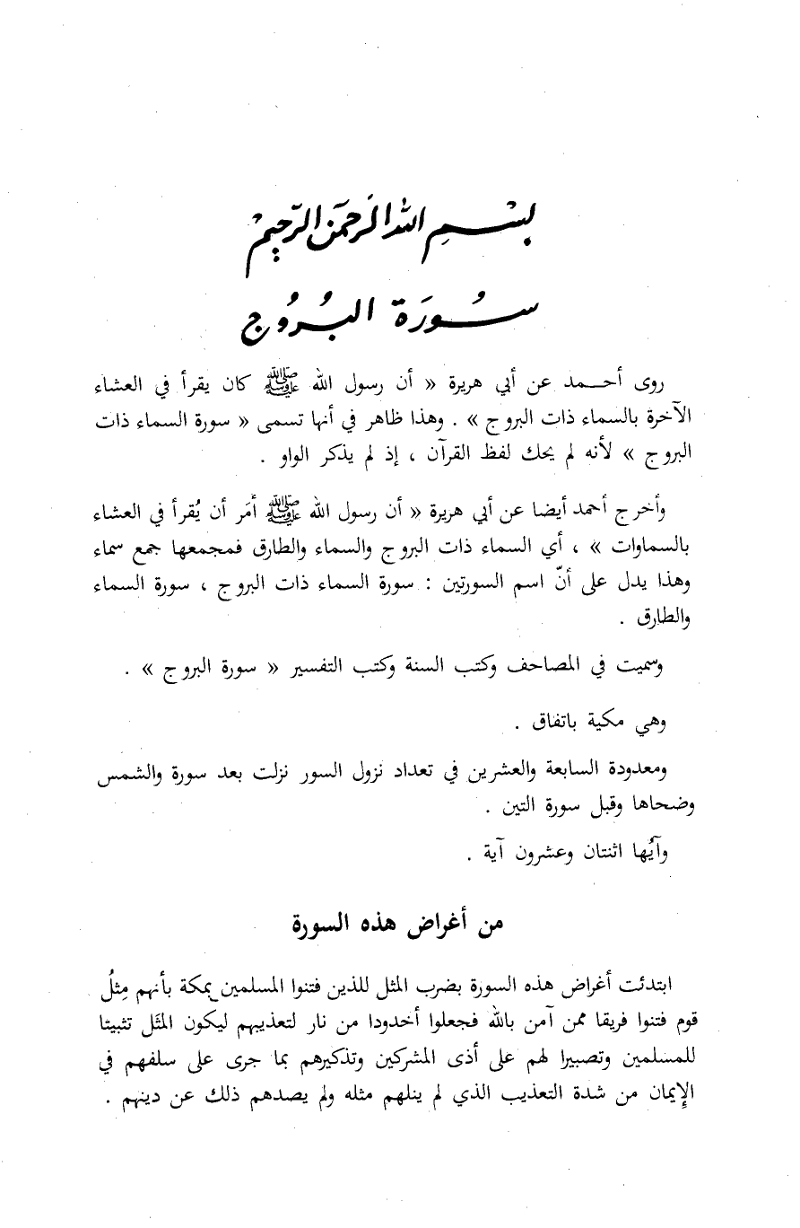 . وَهَذَا ظَاهِرٌ فِي أَنَّهَا تُسَمَّى سُورَةُ «السَّمَاءِ ذَاتِ الْبُرُوجِ» لِأَنَّهُ لَمْ يَحْكِ لَفْظَ الْقُرْآنِ، إِذْ لَمْ يَذْكُرِ الْوَاوَ.
