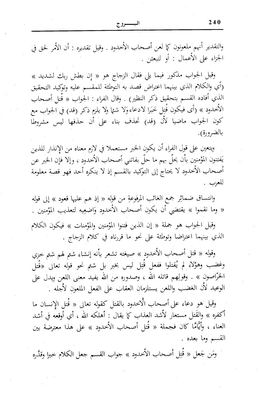 12] (أَيْ وَالْكَلَام الَّذِي بَيْنَهُمَا اعْتِرَاضٌ قُصِدَ بِهِ التَّوْطِئَةُ لِلْمُقْسَمِ عَلَيْهِ وتوكيد التَّحْقِيق الَّذِي أَفَادَهُ الْقَسَمَ بِتَحْقِيقِ ذِكْرِ النَّظِيرِ) . وَقَالَ الْفَرَّاءُ: الْجَوَابُ: قُتِلَ أَصْحابُ الْأُخْدُودِ (أَيْ فَيَكُونُ قتل خَبرا لادعاء وَلَا شَتْمًا وَلَا يَلْزَمُ ذِكْرُ (قَدْ) فِي الْجَوَابِ مَعَ كَوْنِ الْجَوَابِ مَاضِيًا لِأَنَّ (قَدْ) تُحْذَفُ بِنَاءً عَلَى أَنَّ حَذْفَهَا لَيْسَ مَشْرُوطًا بِالضَّرُورَةِ) .