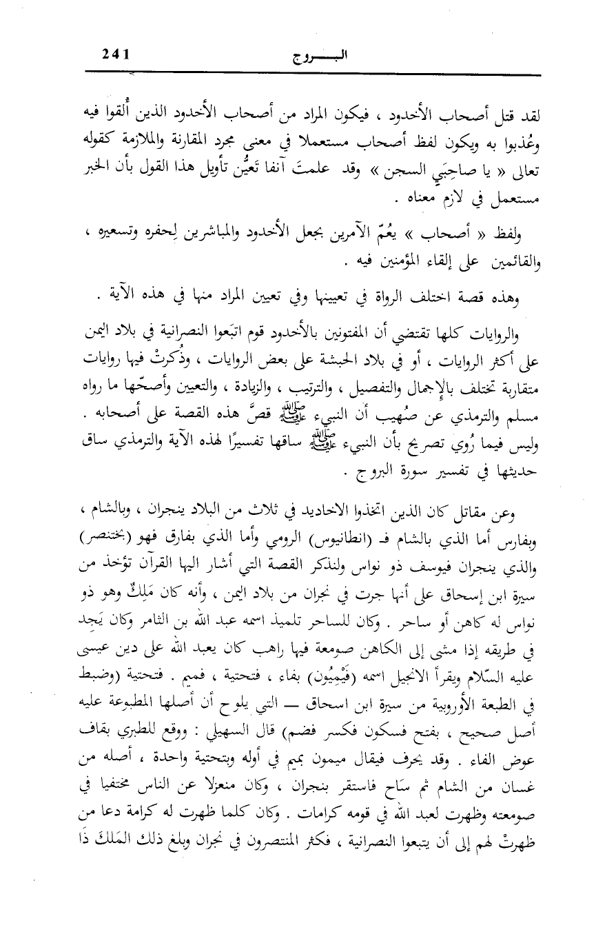 وَعَنْ مُقَاتِلٍ كَانَ الَّذِينَ اتَّخَذُوا الْأَخَادِيدَ فِي ثَلَاثٍ من الْبِلَاد بِنَجْرَان، وَبِالشَّامِ، وَبِفَارِسَ، أما الَّذِي بِالشَّامِ فَ (انْطَانْيُوسُ) الرُّومِيُّ وَأَمَّا الَّذِي بِفَارِسَ فَهُوَ (بُخْتَنَصَّرَ) وَالَّذِي بِنَجْرَانَ فَيُوسُفُ ذُو نُوَاسٍ وَلْنَذْكُرِ الْقِصَّةَ الَّتِي أَشَارَ إِلَيْهَا الْقُرْآنُ تُؤْخَذُ مِنْ «سِيرَةِ ابْنِ إِسْحَاقَ» عَلَى أَنَّهَا جَرَتْ فِي نَجْرَانَ مِنْ بِلَادِ الْيَمَنِ، وَإِنَّهُ كَانَ مَلِكٌ وَهُوَ ذُو نُوَاسٍ لَهُ كَاهِنٌ أَوْ سَاحِرٌ. وَكَانَ لِلسَّاحِرِ تِلْمِيذٌ اسْمُهُ عَبْدُ اللَّهِ بْنُ الثَّامِرِ وَكَانَ يَجِدُ فِي طَرِيقِهِ إِذَا مَشَى إِلَى الْكَاهِنِ صَوْمَعَةً فِيهَا رَاهِبٌ كَانَ يَعْبُدُ اللَّهَ عَلَى دِينِ عِيسَى عَلَيْهِ السَّلَامُ وَيَقْرَأُ الْإِنْجِيلَ اسْمُهُ (فَيْمِيُونُ) بِفَاءٍ، فَتَحْتِيَّةٍ، فَمِيمٍ، فَتَحْتِيَّةٍ (وَضُبِطَ فِي الطبعة الأوروبية مِنْ «سِيرَةِ ابْنِ إِسْحَاقَ» - الَّتِي يَلُوحُ أَنَّ أَصْلَهَا الْمَطْبُوعَةَ عَلَيْهِ أَصْلٌ صَحِيحٌ، بِفَتْحٍ فَسُكُونٍ فَكَسْرٍ فَضَمٍّ) قَالَ السُّهَيْلِيُّ: