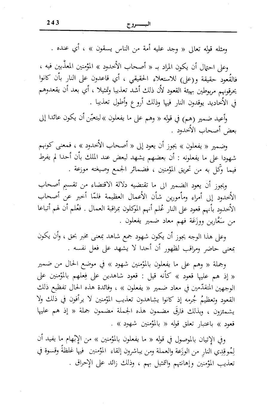 وَيَجُوزُ أَنْ يَعُودَ الضَّمِيرُ إِلَى مَا تَقْتَضِيهِ دَلَالَةُ الِاقْتِضَاءِ مِنْ تَقْسِيمِ أَصْحَابِ الْأُخْدُودِ إِلَى أُمَرَاءَ وَمَأْمُورِينَ شَأْنُ الْأَعْمَالِ الْعَظِيمَةِ، فَلَمَّا أَخْبَرَ عَنْ أَصْحَابِ الْأُخْدُودِ بِأَنَّهُمْ قُعُودٌ عَلَى النَّارِ عَلِمَ أَنَّهُمُ الْمُوَكَّلُونَ بِمُرَاقَبَةِ الْعُمَّالِ. فَعُلِمَ أَنَّ لَهُمْ أَتْبَاعًا مِنْ سَعَّارِينَ وَوَزَعَةٍ فَهُمْ مَعَادُ ضَمِيرِ يَفْعَلُونَ.