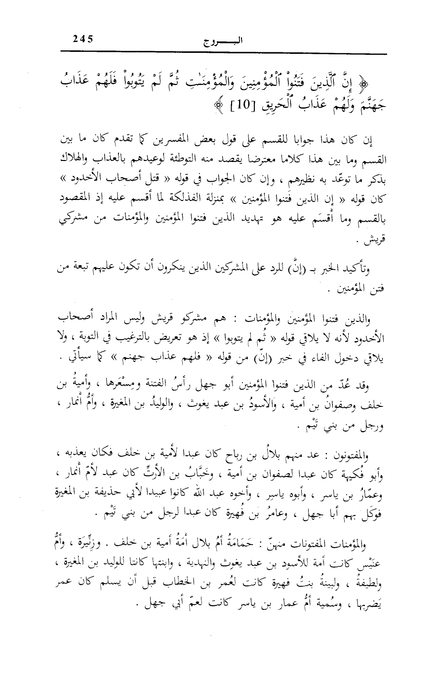 إِنَّ الَّذِينَ فَتَنُوا الْمُؤْمِنِينَ وَالْمُؤْمِناتِ ثُمَّ لَمْ يَتُوبُوا فَلَهُمْ عَذابُ جَهَنَّمَ وَلَهُمْ عَذابُ الْحَرِيقِ (10)