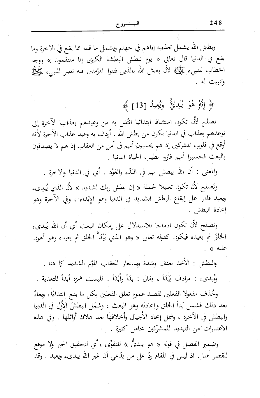 وَتَصْلُحُ لِأَنْ تَكُونَ تَعْلِيلًا لِجُمْلَةِ: إِنَّ بَطْشَ رَبِّكَ لَشَدِيدٌ [البروج: 12] لِأَن الَّذِي يبدىء وَيُعِيدُ قَادِرٌ عَلَى إِيقَاعِ الْبَطْشِ الشَّدِيدِ فِي الدُّنْيَا وَهُوَ الْإِبْدَاءُ، وَفِي الْآخِرَة وَهُوَ إِعَادَةُ الْبَطْشِ.