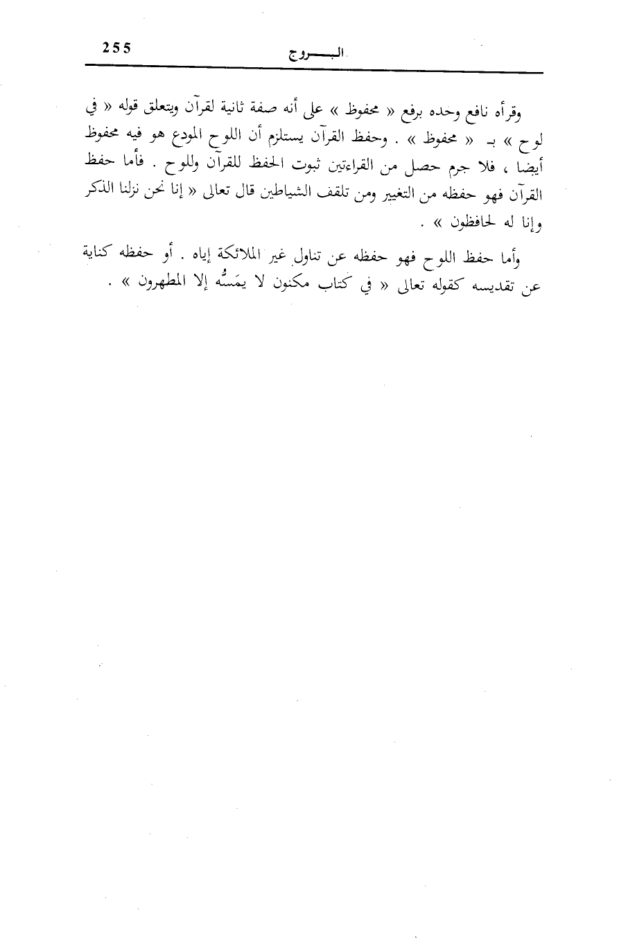 وَقَرَأَهُ نَافِعٌ وَحْدَهُ بِرَفْعِ مَحْفُوظٍ عَلَى أَنَّهُ صِفَةٌ ثَانِيَةٌ لِقُرْآنٍ وَيَتَعَلَّقُ قَوْلُهُ: فِي لَوْحٍ بِ مَحْفُوظٍ وَحِفْظُ الْقُرْآنِ يَسْتَلْزِمُ أَنَّ اللَّوْحَ الْمُودَعَ هُوَ فِيهِ مَحْفُوظٌ أَيْضًا، فَلَا جَرَمَ حَصَلَ مِنَ الْقِرَاءَتَيْنِ ثُبُوتُ الْحِفْظ لِلْقُرْآنِ وللوح. فَأَمَّا حِفْظُ الْقُرْآنِ فَهُوَ حِفْظُهُ مِنَ التَّغْيِيرِ وَمِنْ تَلَقُّفِ الشَّيَاطِينِ قَالَ تَعَالَى: إِنَّا نَحْنُ نَزَّلْنَا الذِّكْرَ وَإِنَّا لَهُ لَحافِظُونَ [الْحجر: 9] .