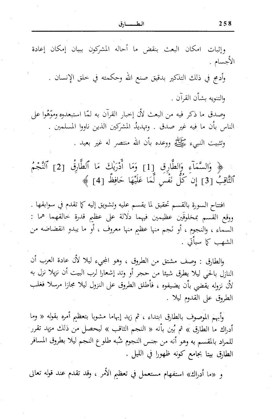 وَأُبْهِمَ الْمَوْصُوفُ بِالطَّارِقِ ابْتِدَاءً، ثُمَّ زِيدَ إِبْهَامًا مَشُوبًا بِتَعْظِيمِ أَمْرِهِ بِقَوْلِهِ: وَما أَدْراكَ مَا الطَّارِقُ ثُمَّ بَيَّنَ بِأَنَّهُ: النَّجْمُ الثَّاقِبُ لِيَحْصُلَ مِنْ ذَلِكَ مَزِيدُ تَقَرُّرٍ لِلْمُرَادِ بِالْمُقْسَمِ بِهِ وَهُوَ أَنَّهُ مِنْ جِنْسِ النُّجُومِ، شُبِّهَ طُلُوعُ النَّجْمِ لَيْلًا بِطُرُوقِ الْمُسَافِرِ الطَّارِقِ بَيْتًا بِجَامِعِ كَوْنِهِ ظُهُورًا فِي اللَّيْلِ.