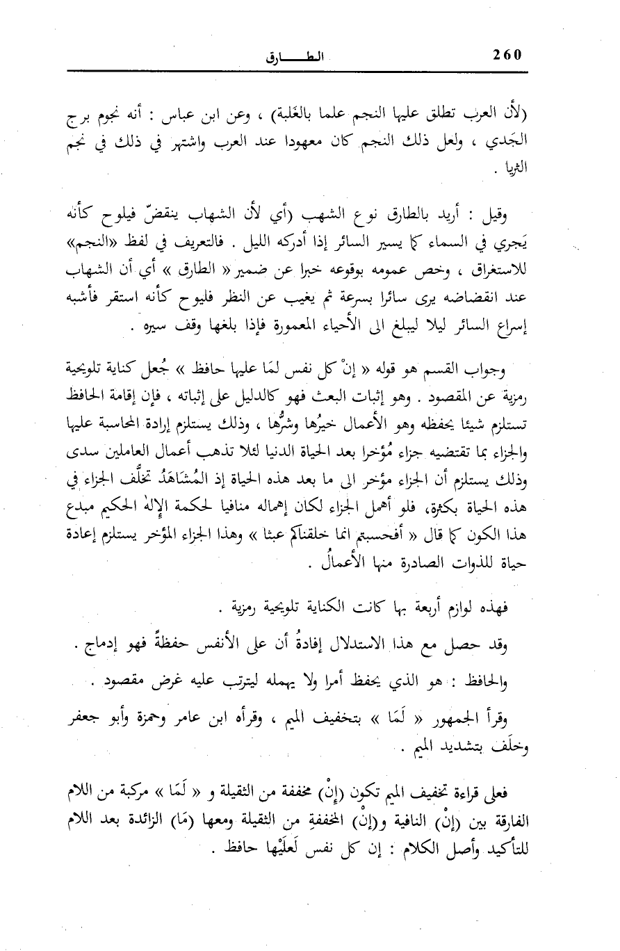 وَقِيلَ: أُرِيدَ بِالطَّارِقِ نَوْعُ الشُّهُبِ (أَيْ لِأَنَّ الشِّهَابَ يَنْقَضُّ فَيَلُوحُ كَأَنَّهُ يَجْرِي فِي السَّمَاءِ كَمَا يسير السائر إِذا أَدْرَكَهُ اللَّيْلُ) . فَالتَّعْرِيفُ فِي لَفْظِ النَّجْمُ لِلِاسْتِغْرَاقِ، وَخُصَّ عُمُومُهُ بِوُقُوعِهِ خَبَرًا عَنْ ضَمِيرِ الطَّارِقِ أَيْ أَنَّ الشِّهَابَ عِنْدَ انْقِضَاضِهِ يُرَى سَائِرًا بِسُرْعَةٍ ثُمَّ يَغِيبُ عَنِ النَّظَرِ فَيَلُوحُ كَأَنَّهُ اسْتَقَرَّ فَأَشْبَهَ إِسْرَاعَ السَّائِرِ لَيْلًا ليبلغ إِلَى الْأَحْيَاء الْمَعْمُورَةِ فَإِذَا بَلَغَهَا وَقَفَ سَيْرُهُ.