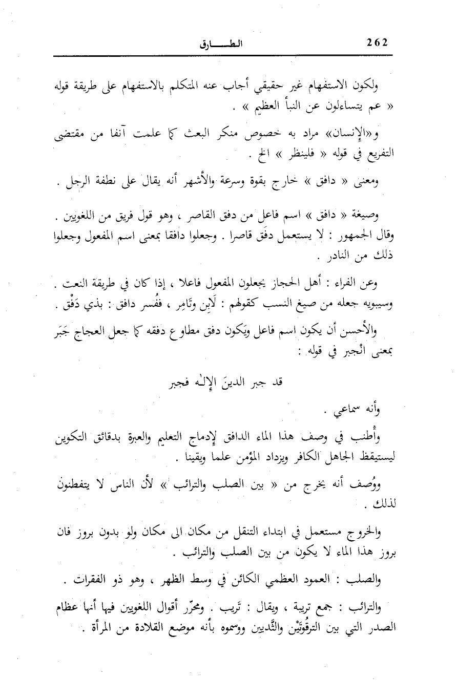 وَمَعْنَى دافِقٍ خَارِجٌ بِقُوَّةٍ وَسُرْعَةٍ وَالْأَشْهَرُ أَنَّهُ يُقَالُ عَلَى نُطْفَةِ الرَّجُلِ.
