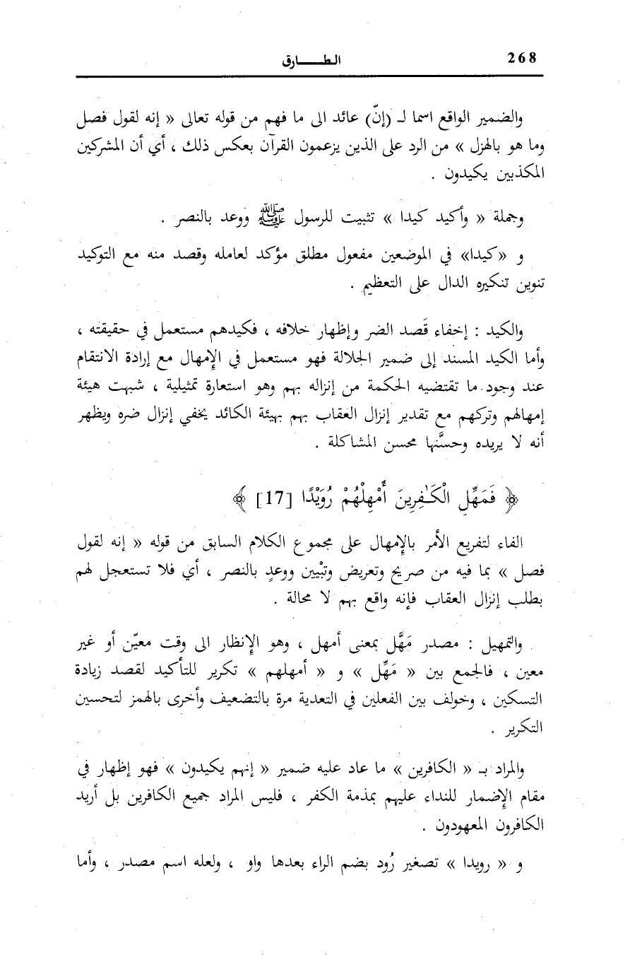 وَالْمُرَادُ بِ الْكافِرِينَ مَا عَادَ عَلَيْهِ ضَمِيرُ إِنَّهُمْ يَكِيدُونَ [الطارق: 15] فَهُوَ إِظْهَارٌ فِي مَقَامِ الْإِضْمَارِ لِلنِّدَاءِ عَلَيْهِمْ بِمَذَمَّةِ الْكُفْرِ، فَلَيْسَ الْمُرَادُ جَمِيعَ الْكَافِرِينَ بَلْ أُرِيدَ الْكَافِرُونَ الْمَعْهُودُونَ.