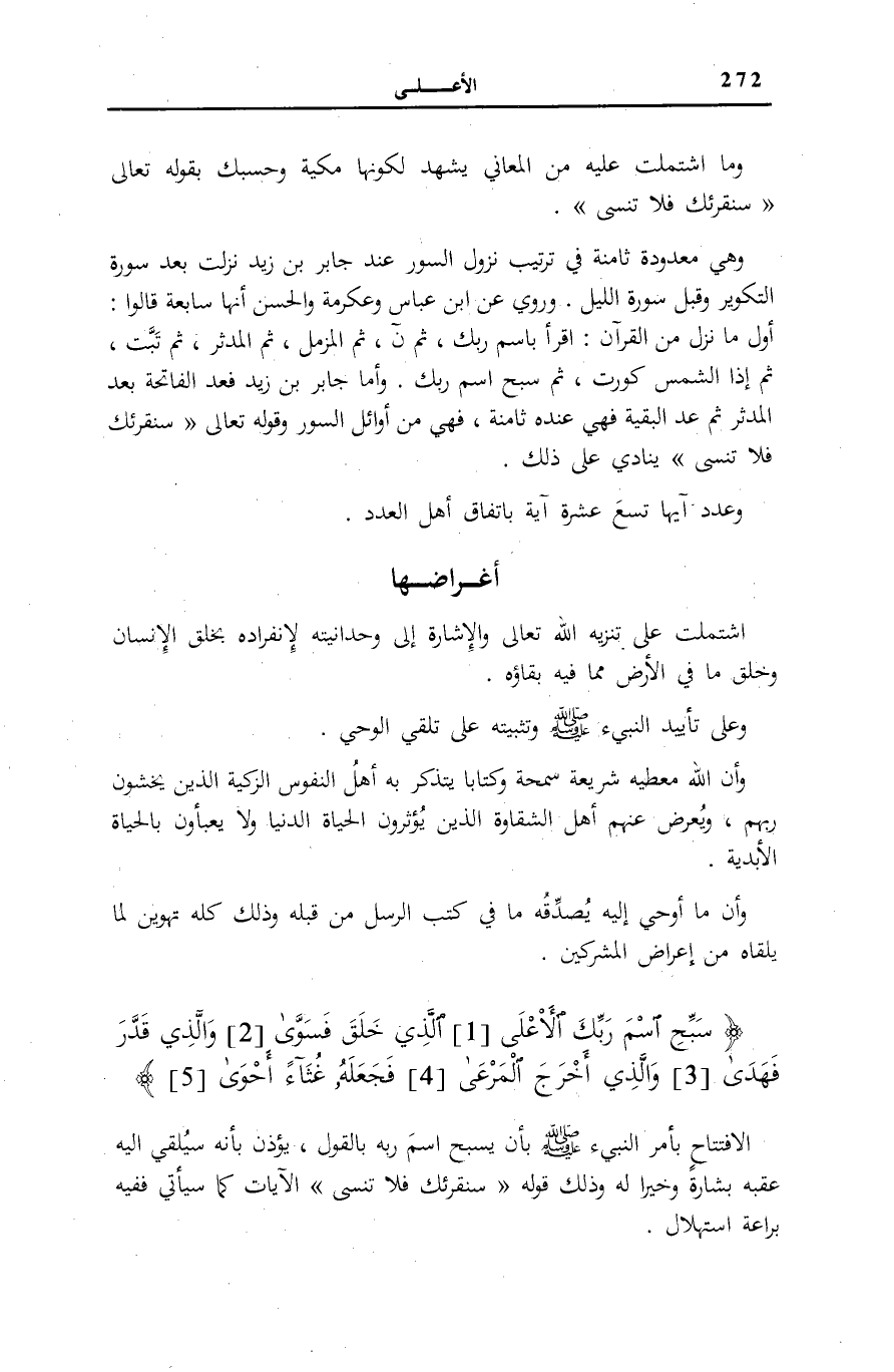 سَبِّحِ اسْمَ رَبِّكَ الْأَعْلَى (1) الَّذِي خَلَقَ فَسَوَّى (2) وَالَّذِي قَدَّرَ فَهَدى (3) وَالَّذِي أَخْرَجَ الْمَرْعى (4)