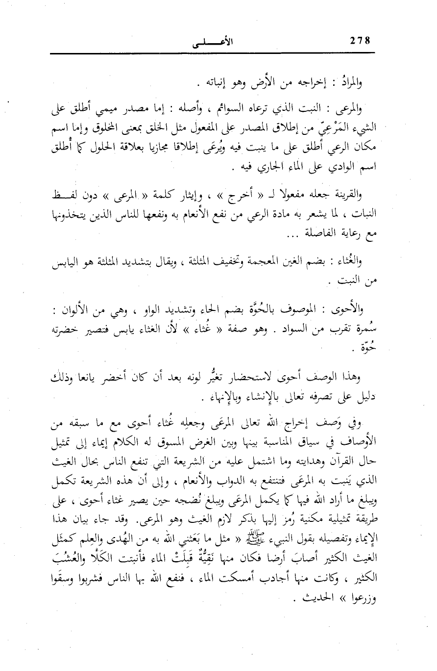 الَّذِي يَنْبُتُ بِهِ الْمَرْعَى فَتَنْتَفِعُ بِهِ الدَّوَابُّ وَالْأَنْعَامُ، وَإِلَى أَنَّ هَذِهِ الشَّرِيعَةَ تَكْمُلُ وَيَبْلُغُ مَا أَرَادَ اللَّهُ فِيهَا كَمَا يَكْمُلُ الْمَرْعَى وَيَبْلُغُ نُضْجَهُ حِينَ يَصِيرُ غُثَاءً أَحَوَى، عَلَى طَرِيقَةٍ تَمْثِيلِيَّةٍ مَكْنِيَّةٍ رُمِزَ إِلَيْهَا بِذِكْرِ لَازِمِ الْغَيْثِ وَهُوَ الْمَرْعَى. وَقَدْ جَاءَ بَيَانُ هَذَا الْإِيمَاءِ وَتَفْصِيلِهِ