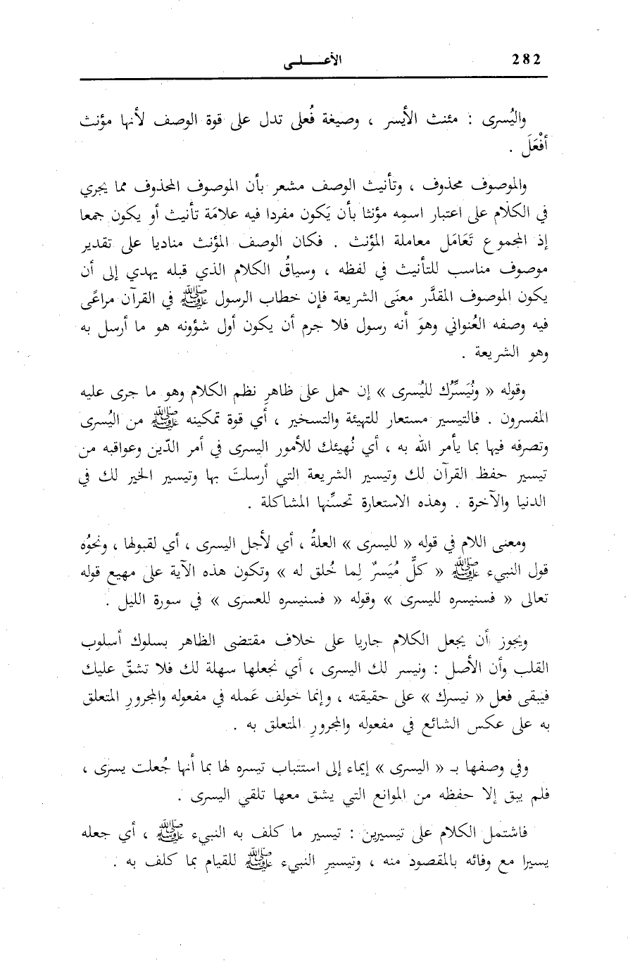 وَقَوْلُهُ: وَنُيَسِّرُكَ لِلْيُسْرى إِنْ حُمِلَ عَلَى ظَاهِرِ نَظْمِ الْكَلَامِ وَهُوَ مَا جَرَى عَلَيْهِ الْمُفَسِّرُونَ. فَالتَّيْسِيرُ مُسْتَعَارٌ لِلتَّهْيِئَةِ وَالتَّسْخِيرِ، أَيْ قُوَّةُ تَمْكِينِهِ صَلَّى اللهُ عَلَيْهِ وَسَلَّمَ مِنَ الْيُسْرَى وَتَصَرُّفِهِ فِيهَا بِمَا يَأْمُرُ اللَّهُ بِهِ، أَيْ نُهَيِّئُكَ لِلْأُمُورِ الْيُسْرَى فِي أَمْرِ الدِّينِ وَعَوَاقِبِهِ مِنْ تَيْسِيرِ حِفْظِ الْقُرْآنِ لَكَ وَتَيْسِيرِ الشَّرِيعَةِ الَّتِي أُرْسِلْتَ بِهَا وَتَيْسِيرِ الْخَيْرِ لَكَ فِي الدُّنْيَا وَالْآخِرَةِ. وَهَذِهِ الِاسْتِعَارَةُ تُحَسِّنُهَا الْمُشَاكَلَةُ.