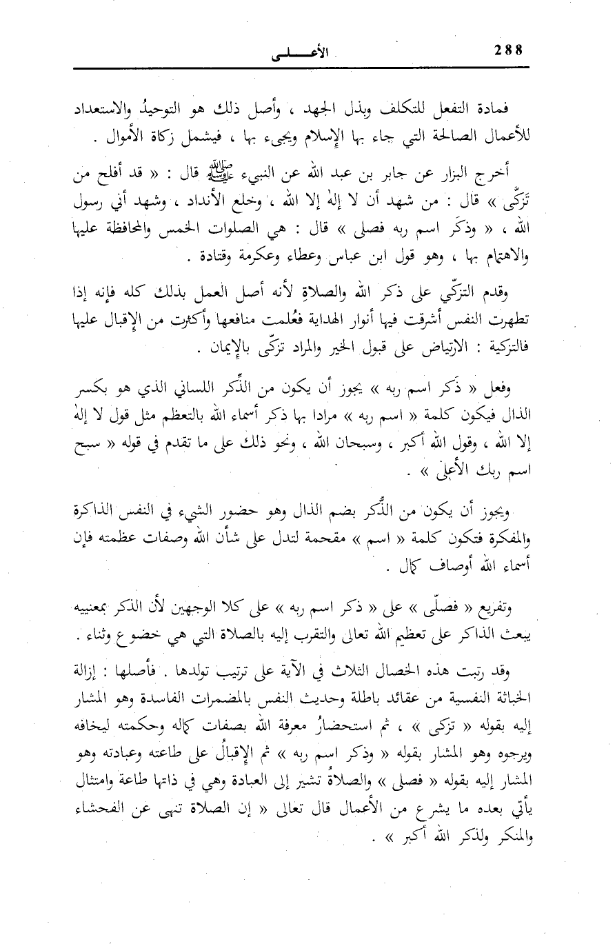 بقوله: وَذَكَرَ اسْمَ رَبِّهِ ثمَّ الإقبال على طَاعَته وعبادته وَهُوَ الْمُشَارُ إِلَيْهِ بِقَوْلِهِ: فَصَلَّى وَالصَّلَاةُ تُشِيرُ إِلَى الْعِبَادَةِ وَهِيَ فِي ذَاتِهَا طَاعَةٌ وَامْتِثَالٌ يَأْتِي بَعْدَهُ مَا يُشْرَعُ مِنَ الْأَعْمَالِ قَالَ تَعَالَى: إِنَّ الصَّلاةَ تَنْهى عَنِ الْفَحْشاءِ وَالْمُنْكَرِ وَلَذِكْرُ اللَّهِ أَكْبَرُ [العنكبوت: 45] .