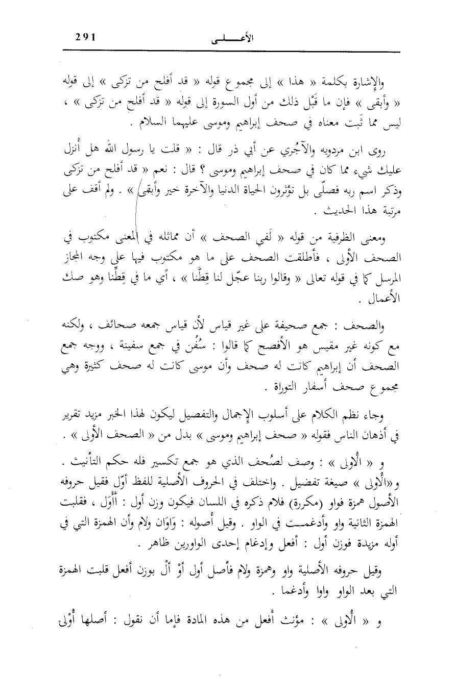 وَجَاءَ نَظْمُ الْكَلَامِ عَلَى أُسْلُوبِ الْإِجْمَالِ وَالتَّفْصِيل ليَكُون لهَذَا الْخَبَرُ مَزِيدَ تَقْرِيرٍ فِي أَذْهَانِ النَّاسِ فَقَوْلُهُ: صُحُفِ إِبْراهِيمَ وَمُوسى بَدَلٌ مِنَ الصُّحُفِ الْأُولى والْأُولى: وَصْفٌ لِصُحُفٍ الَّذِي هُوَ جَمْعُ تَكْسِيرٍ فَلَهُ حُكْمُ التَّأْنِيثِ. والْأُولى صِيغَةُ تَفْضِيلٍ. وَاخْتُلِفَ فِي الْحُرُوفِ الْأَصْلِيَّةِ لِلَّفْظِ أَوَّلٍ فَقِيلَ: حُرُوفُهُ الْأُصُولُ هَمْزَةٌ فَوَاوٌ (مُكَرَّرَةٌ) فَلَامٌ ذكره فِي «للسان» فَيَكُونُ وَزْنُ أَوَّلٍ: أَأْوَلُ، فَقُلِبَتِ الْهَمْزَةُ الثَّانِيَةُ وَاوًا وَأُدْغِمَتْ فِي الْوَاوِ. وَقِيلَ: أُصُولُهُ: وَاوَانِ وَلَامٌ وَأَنَّ الْهَمْزَةَ الَّتِي فِي أَوَّلِهِ مَزِيدَةٌ فَوَزْنُ أَوَّلَ: أَفْعَلُ وَإِدْغَامُ إِحْدَى الْوَاوَيْنِ ظَاهِرٌ.