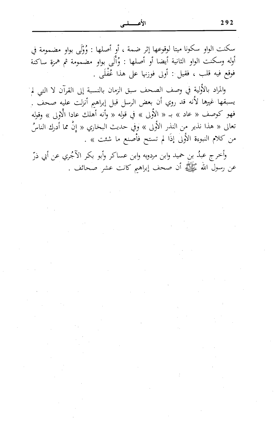 وَالْمُرَادُ بِالْأَوَّلِيَّةِ فِي وَصْفِ الصُّحُفِ سَبْقُ الزَّمَانِ بِالنِّسْبَةِ إِلَى الْقُرْآنِ لَا الَّتِي لَمْ يَسْبِقْهَا غَيْرُهَا لِأَنَّهُ قَدْ رُوِيَ أَنَّ بَعْضَ الرُّسُلِ قَبْلَ إِبْرَاهِيم أنزلت عَلَيْهِ صُحُفٌ فَهُوَ كَوَصْفِ (عَادٍ)