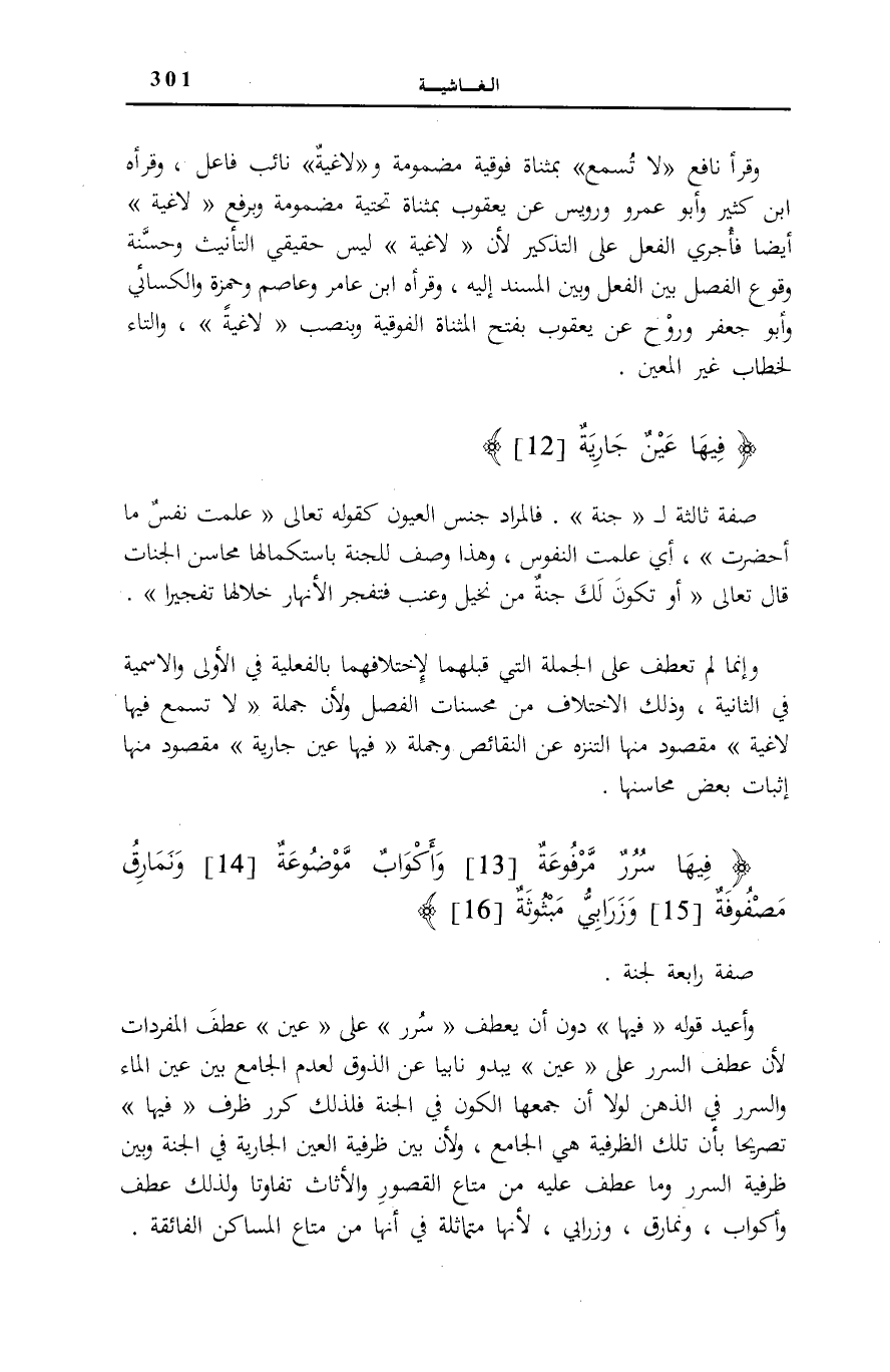 وَأُعِيدَ قَوْلُهُ: فِيها دُونَ أَنْ يُعْطَفَ سُرُرٌ على عَيْنٌ [الغاشية: 12] عَطْفَ الْمُفْرِدَاتِ لِأَنَّ عَطْفَ السُّرُرِ عَلَى عَيْنٌ يَبْدُو نَابِيًا عَن الذَّوْق لعدم الْجَامِعِ بَيْنَ عَيْنِ الْمَاءِ وَالسُّرُرِ فِي الذِّهْنِ لَوْلَا أَنْ جَمَعَهَا الْكَوْنُ فِي الْجَنَّةِ فَلِذَلِكَ كُرِّرَ ظَرْفُ فِيها تَصْرِيحًا بِأَنَّ تِلْكَ الظَّرْفِيَّةَ هِيَ الْجَامِعُ، وَلِأَنَّ بَيْنَ ظَرْفِيَّةِ الْعَيْنِ الْجَارِيَةِ فِي الْجَنَّةِ وَبَيْنَ ظَرْفِيَّةِ السُّرُرِ وَمَا عُطِفَ عَلَيْهِ مِنْ مَتَاعِ الْقُصُورِ وَالْأَثَاثِ تَفَاوُتًا وَلِذَلِكَ عُطِفَ وَأَكْوابٌ، وَنَمارِقُ، وَزَرابِيُّ، لِأَنَّهَا مُتَمَاثِلَةٌ فِي أَنَّهَا مِنْ مَتَاعِ الْمَسَاكِنِ الْفَائِقَةِ.