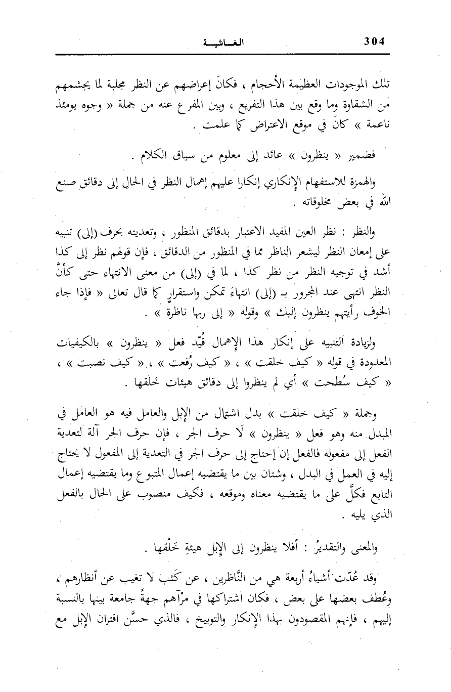وَجُمْلَةُ: كَيْفَ خُلِقَتْ بَدَلُ اشْتِمَالٍ مِنَ الْإِبِلِ وَالْعَامِلُ فِيهِ هُوَ الْعَامِلُ فِي الْمُبْدَلِ مِنْهُ وَهُوَ فِعْلُ يَنْظُرُونَ لَا حَرْفُ الْجَرِّ، فَإِنَّ حَرْفَ الْجَرِّ آلَةٌ لِتَعْدِيَةِ الْفِعْلِ إِلَى مَفْعُولِهِ فَالْفِعْلُ إِنِ احْتَاجَ إِلَى حَرْفِ الْجَرِّ فِي التَّعْدِيَةِ إِلَى الْمَفْعُولِ لَا يَحْتَاجُ إِلَيْهِ فِي الْعَمَلِ فِي الْبَدَلِ، وَشَتَّانَ بَيْنَ مَا يَقْتَضِيهِ إِعْمَالُ الْمَتْبُوعِ وَمَا يَقْتَضِيهِ إِعْمَالُ التَّابِعِ فَكُلٌّ عَلَى مَا يَقْتَضِيهِ مَعْنَاهُ وَمَوْقِعُهُ، فَكَيْفَ مَنْصُوبٌ عَلَى الْحَالِ بِالْفِعْلِ الَّذِي يَلِيهِ.