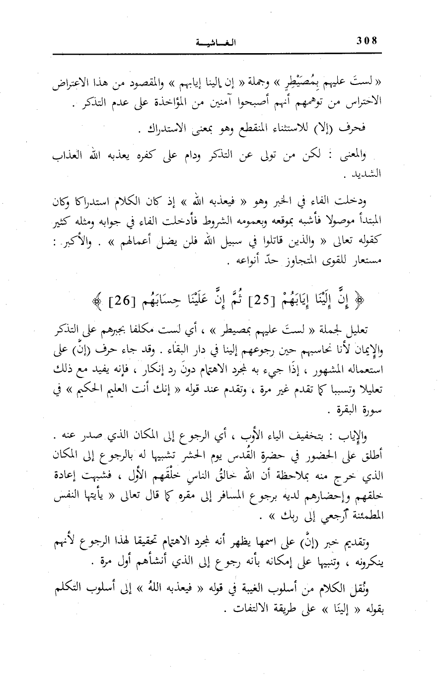تَعْلِيلٌ لِجُمْلَةِ: لَسْتَ عَلَيْهِمْ بِمُصَيْطِرٍ [الغاشية: 22] ، أَيْ لَسْتَ مُكَلَّفًا بِجَبْرِهِمْ عَلَى التَّذَكُّرِ وَالْإِيمَانِ لِأَنَّا نُحَاسِبُهُمْ حِينَ رُجُوعِهِمْ إِلَيْنَا فِي دَارِ الْبَقَاءِ. وَقَدْ جَاءَ حَرْفُ إِنَّ عَلَى اسْتِعْمَالِهِ الْمَشْهُورِ، إِذَا جِيءَ بِهِ الْمُجَرّد الِاهْتِمَامِ دُونَ رَدِّ إِنْكَارٍ، فَإِنَّهُ يُفِيدُ مَعَ ذَلِكَ تَعْلِيلًا وَتَسَبُّبًا كَمَا تَقَدَّمَ غَيْرَ مَرَّةٍ، وَتَقَدَّمَ عِنْدَ قَوْلِهِ: إِنَّكَ أَنْتَ الْعَلِيمُ الْحَكِيمُ فِي سُورَةِ الْبَقَرَةِ [32] .