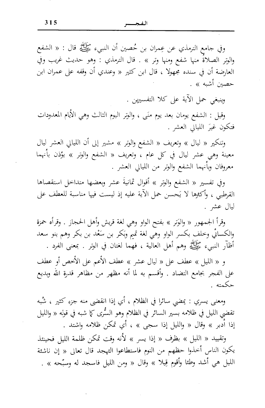 وَتَنْكِيرُ لَيالٍ وَتَعْرِيفُ الشَّفْعِ وَالْوَتْرِ مُشِيرٌ إِلَى أَنَّ اللَّيَالِيَ الْعَشْرَ لَيَالٍ مُعَيَّنَةٌ وَهِيَ عَشْرُ لَيَالٍ فِي كُلِّ عَامٍ، وَتَعْرِيفُ الشَّفْعِ وَالْوَتْرِ يُؤْذِنُ بِأَنَّهُمَا مَعْرُوفَانِ وَبِأَنَّهُمَا الشَّفْعُ وَالْوَتْرُ مِنَ اللَّيَالِي الْعَشْرِ.