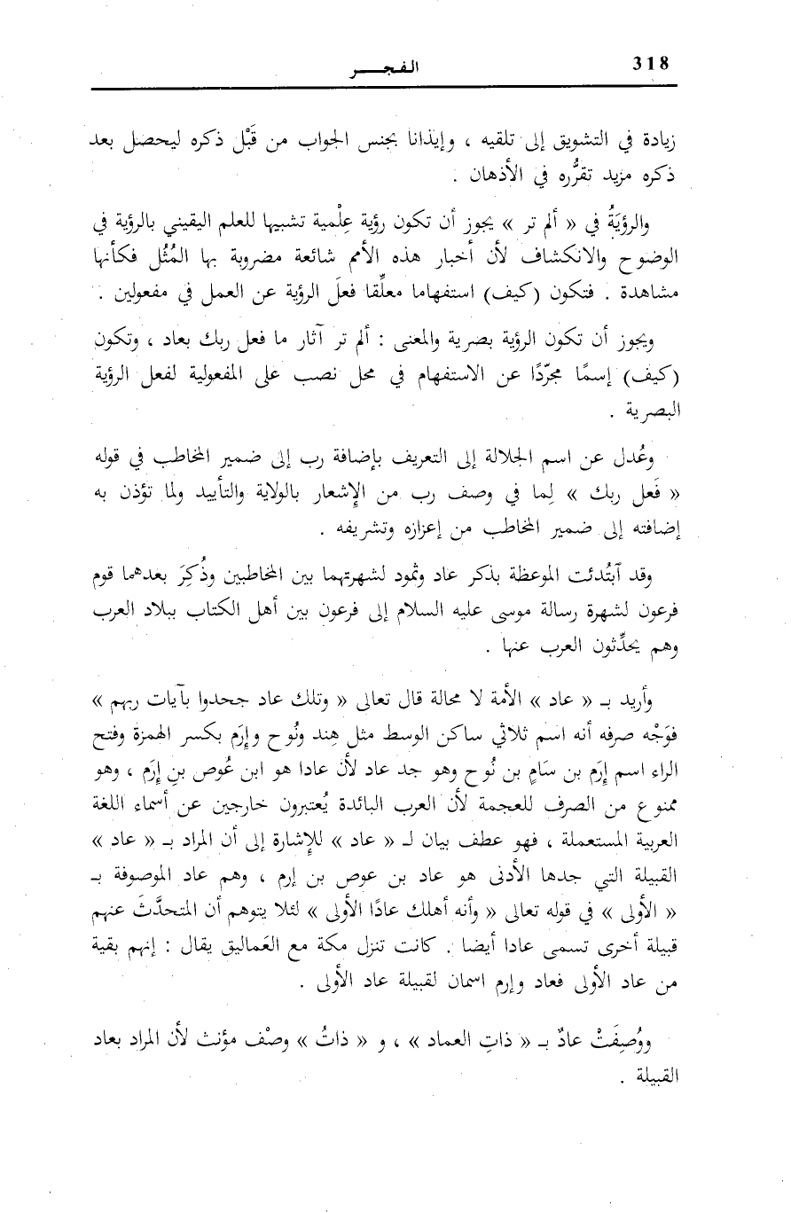 وَيَجُوزُ أَنْ تَكُونَ الرُّؤْيَةُ بَصَرِيَّةً وَالْمَعْنَى: أَلَمْ تَرَ آثَارَ مَا فَعَلَ رَبُّكَ بِعَادٍ، وَتَكُونُ كَيْفَ اسْمًا مُجَرَّدًا عَنِ الِاسْتِفْهَامِ فِي مَحَلِّ نَصْبٍ عَلَى الْمَفْعُولِيَّةِ لِفِعْلِ الرُّؤْيَةِ الْبَصَرِيَّةِ.