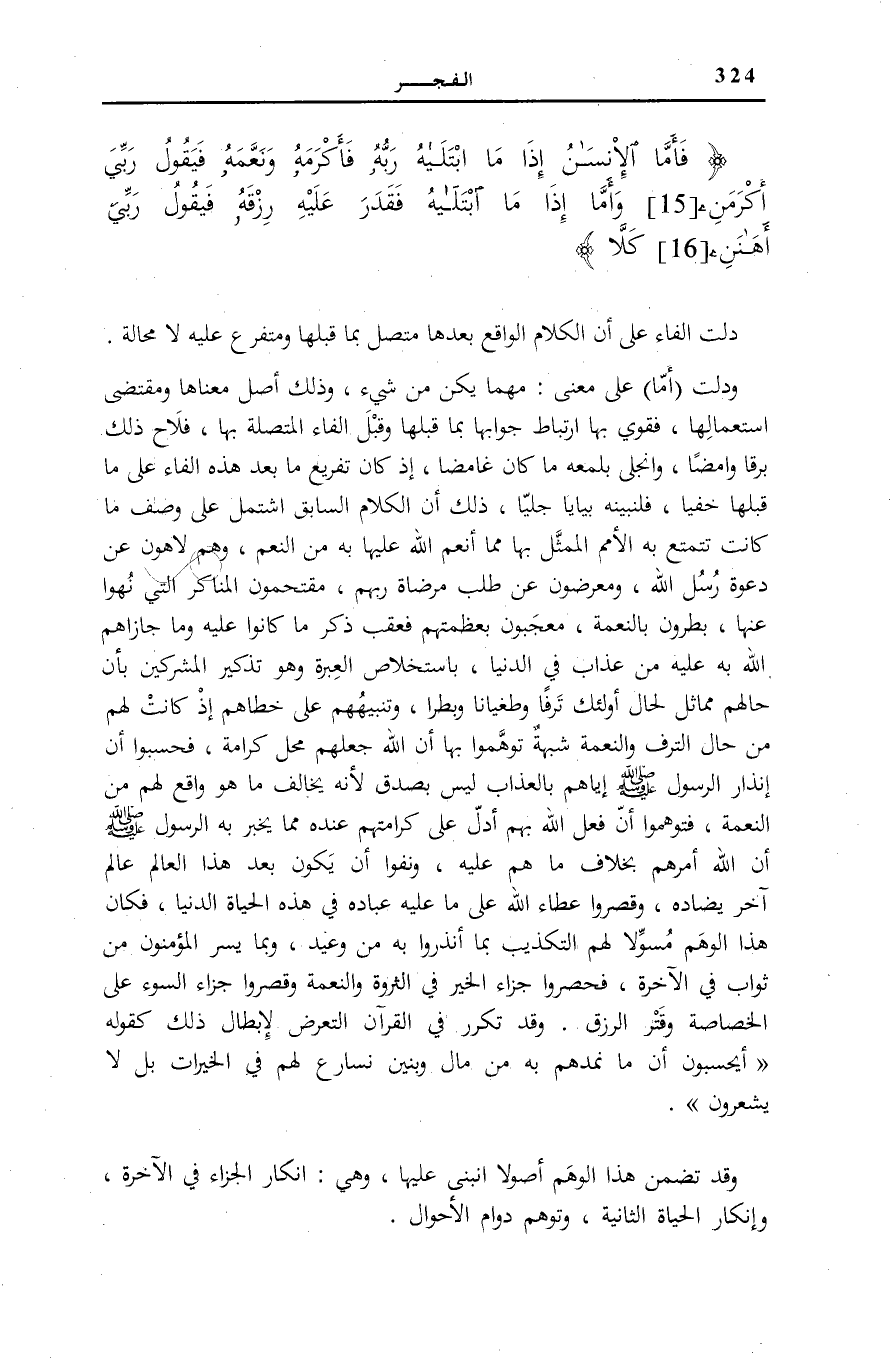 وَدَلَّتْ (أَمَّا) عَلَى مَعْنَى: مَهْمَا يَكُنْ مِنْ شَيْءٍ، وَذَلِكَ أَصْلُ مَعْنَاهَا وَمُقْتَضَى اسْتِعْمَالِهَا، فَقَوِيَ بِهَا ارْتِبَاطُ جَوَابِهَا بِمَا قَبْلَهَا وَقَبْلَ الْفَاءِ الْمُتَّصِلَةِ بِهَا، فَلَاحَ ذَلِكَ بَرْقًا وَامِضًا، وَانْجَلَى بِلَمْعِهِ مَا كَانَ غَامِضًا، إِذْ كَانَ تَفْرِيعُ مَا بَعْدَ هَذِهِ الْفَاءِ عَلَى مَا قَبْلَهَا خَفِيًّا، فَلْنُبَيِّنْهُ بَيَانًا جَلِيًّا، ذَلِكَ أَنَّ الْكَلَامَ السَّابِقَ اشْتَمَلَ عَلَى وَصْفِ مَا كَانَتْ تَتَمَتَّعُ بِهِ الْأُمَمُ الْمُمَثَّلُ بِهَا مِمَّا أَنْعَمَ اللَّهُ عَلَيْهَا بِهِ مِنَ النِّعَمِ، وَهُمْ لَاهُونَ عَنْ دَعْوَةِ رُسُلِ اللَّهِ، وَمُعْرِضُونَ عَنْ طَلَبِ مَرْضَاةِ رَبِّهِمْ، مُقْتَحِمُونَ الْمَنَاكِرَ الَّتِي نُهُوا عَنْهَا، بَطِرُونَ بِالنِّعْمَةِ، مُعْجَبُونَ بِعَظَمَتِهِمْ فَعَقَّبَ ذِكْرَ مَا كَانُوا عَلَيْهِ وَمَا جَازَاهُمُ اللَّهُ بِهِ عَلَيْهِ مِنْ عَذَابٍ فِي الدُّنْيَا، بِاسْتِخْلَاصِ الْعِبْرَةِ وَهُوَ تَذْكِيرُ الْمُشْرِكِينَ بِأَنَّ حَالَهُمْ مُمَاثِلٌ لِحَالِ أُولَئِكَ تَرَفًا وَطُغْيَانًا وَبَطَرًا، وَتَنْبِيهُهُمْ عَلَى خَطَاهُمْ إِذْ كَانَتْ لَهُمْ مِنْ حَالِ التَّرَفِ وَالنِّعْمَةِ شُبْهَةٌ تَوَهَّمُوا بِهَا أَنَّ اللَّهَ جَعَلَهُمْ مَحَلَّ كَرَامَةٍ، فَحَسِبُوا أَنَّ إِنْذَارَ الرَّسُولِ صَلَّى اللهُ عَلَيْهِ وَسَلَّمَ إِيَّاهُمْ بِالْعَذَابِ لَيْسَ بِصِدْقٍ لِأَنَّهُ يُخَالِفُ مَا هُوَ وَاقِعٌ لَهُمْ مِنَ النِّعْمَةِ، فَتَوَهَّمُوا أَنَّ فِعْلَ اللَّهِ بِهِمْ أَدَلُّ عَلَى كَرَامَتِهِمْ عِنْدَهُ مِمَّا يُخْبِرُ بِهِ الرَّسُولُ صَلَّى اللهُ عَلَيْهِ وَسَلَّمَ أَنَّ اللَّهَ أَمَرَهُمْ بِخِلَافِ مَا هُمْ عَلَيْهِ، وَنَفَوْا أَنْ يَكُونَ بَعْدَ هَذَا الْعَالَمِ عَالَمٌ آخَرُ يُضَادُّهُ، وَقَصَرُوا عَطَاءَ اللَّهِ عَلَى مَا عَلَيْهِ عِبَادُهُ فِي هَذِهِ الْحَيَاةِ الدُّنْيَا، فَكَانَ هَذَا