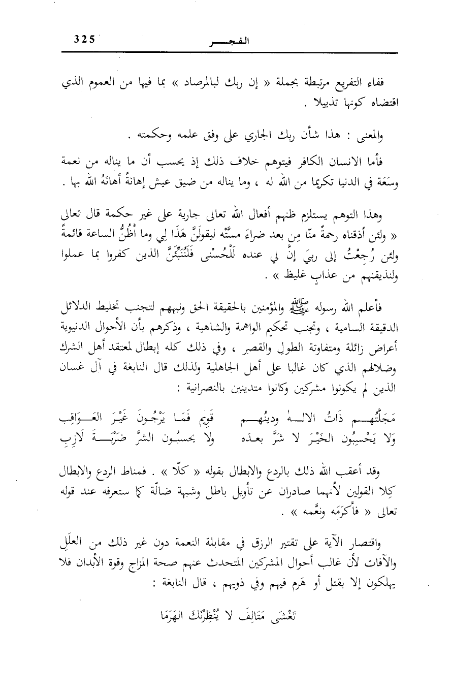 فَأَعْلَمُ الله رَسُوله صَلَّى اللهُ عَلَيْهِ وَسَلَّمَ وَالْمُؤمنِينَ بِالْحَقِيقَةِ الْحَقِّ وَنَبَّهَهُمْ لِتَجَنُّبِ تَخْلِيطِ الدَّلَائِلِ الدَّقِيقَةِ السَّامِيَةِ، وَتَجَنُّبِ تَحْكِيمِ الْوَاهِمَةِ وَالشَّاهِيَةِ، وَذَكَّرَهُمْ بِأَنَّ الْأَحْوَالَ الدُّنْيَوِيَّةَ أَعْرَاضٌ زَائِلَةٌ وَمُتَفَاوِتَةُ الطُّولِ وَالْقِصَرِ، وَفِي ذَلِكَ كُلِّهِ إِبْطَالٌ لِمُعْتَقَدِ أَهْلِ الشِّرْكِ وَضَلَالِهِمُ الَّذِي كَانَ غَالِبًا عَلَى أَهْلِ الْجَاهِلِيَّةِ وَلِذَلِكَ قَالَ النَّابِغَةُ فِي آلِ غَسَّانَ الَّذِينَ لَمْ يَكُونُوا مُشْرِكِينَ وَكَانُوا مُتَدَيِّنِينَ بِالنَّصْرَانِيَّةِ: