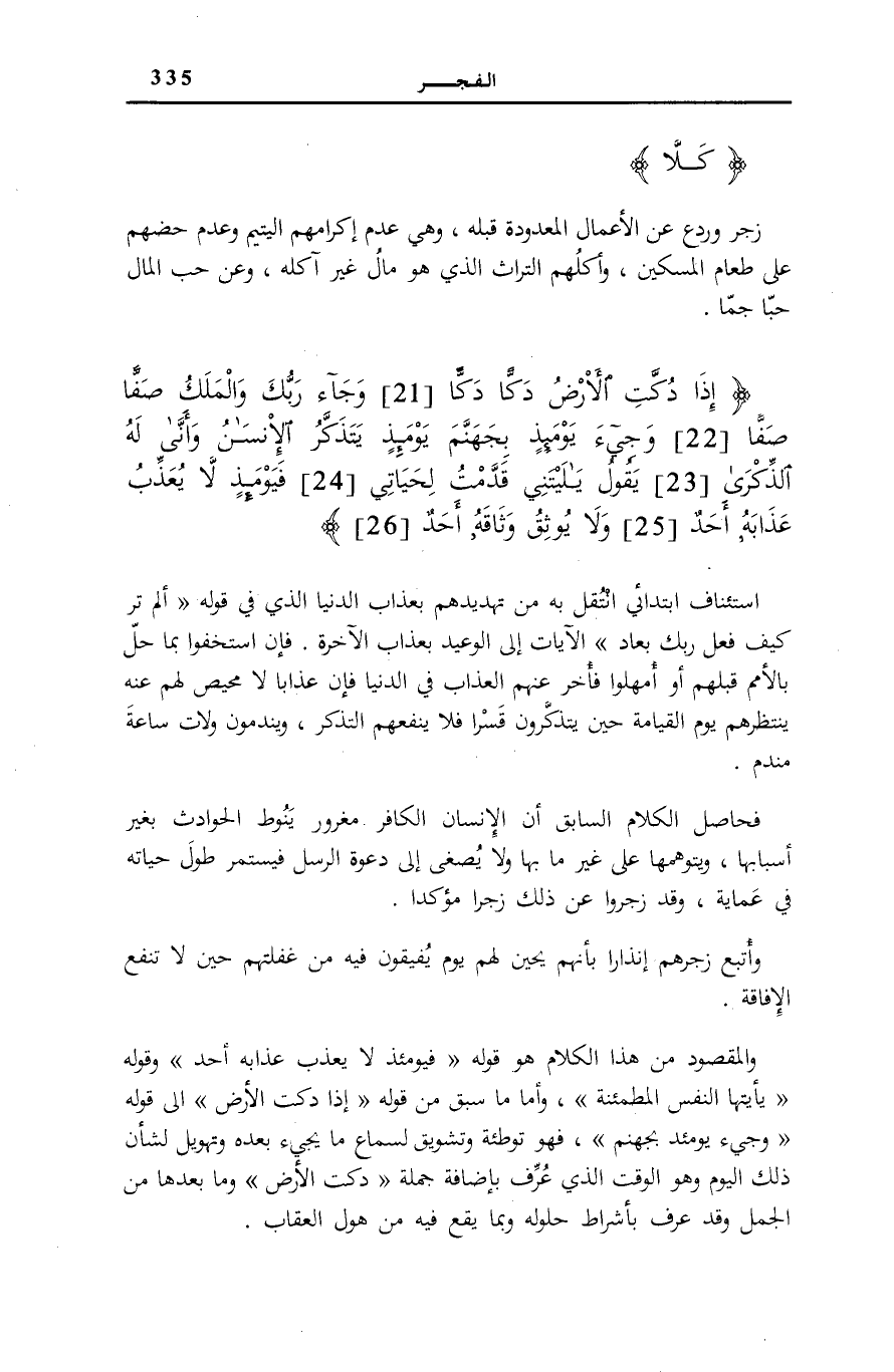 إِذا دُكَّتِ الْأَرْضُ دَكًّا دَكًّا 21 وَجاءَ رَبُّكَ وَالْمَلَكُ صَفًّا صَفًّا 22 وَجِيءَ يَوْمَئِذٍ بِجَهَنَّمَ يَوْمَئِذٍ يَتَذَكَّرُ الْإِنْسانُ وَأَنَّى لَهُ الذِّكْرى 23 يَقُولُ يَا لَيْتَنِي قَدَّمْتُ لِحَياتِي 24 فَيَوْمَئِذٍ لَا يُعَذِّبُ عَذابَهُ أَحَدٌ 25 وَلا يُوثِقُ وَثاقَهُ أَحَدٌ 26 اسْتِئْنَافٌ ابْتِدَائِيٌّ انْتُقِلَ بِهِ مِنْ تَهْدِيدِهِمْ بِعَذَابِ الدُّنْيَا الَّذِي فِي قَوْلِهِ: أَلَمْ تَرَ كَيْفَ فَعَلَ رَبُّكَ بِعادٍ [الْفجْر: 6] الْآيَاتِ إِلَى الْوَعِيدِ بِعَذَابِ الْآخِرَةِ. فَإِنِ اسْتَخَفُّوا بِمَا حَلَّ بِالْأُمَمِ قَبْلَهُمْ أَوْ أُمْهِلُوا فَأُخِّرَ عَنْهُمُ الْعَذَابُ فِي الدُّنْيَا فَإِنَّ عَذَابًا لَا مَحِيصَ لَهُمْ عَنْهُ يَنْتَظِرُهُمْ يَوْمَ الْقِيَامَةِ حِينَ يَتَذَكَّرُونَ قَسْرًا فَلَا يَنْفَعُهُمُ التَّذَكُّرُ، وَيَنْدَمُونَ وَلَاتَ سَاعَةَ مَنْدَمٍ.