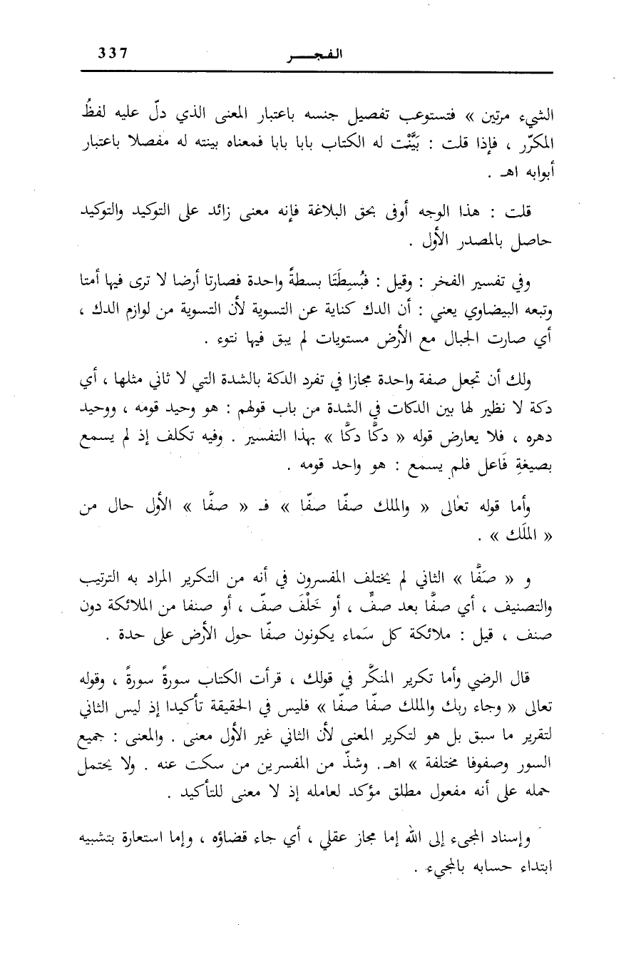 وَجاءَ رَبُّكَ وَالْمَلَكُ صَفًّا صَفًّا فَلَيْسَ فِي الْحَقِيقَةِ تَأْكِيدًا إِذْ لَيْسَ الثَّانِي لِتَقْرِيرِ مَا سَبَقَ بَلْ هُوَ لِتَكْرِيرِ الْمَعْنَى لِأَنَّ الثَّانِيَ غَيْرُ الْأَوَّلِ مَعْنًى. وَالْمَعْنَى: جَمِيعُ السُّوَرِ وَصُفُوفًا مُخْتَلِفَةً اهـ. وَشَذَّ مِنَ الْمُفَسِّرِينَ مَنْ سَكْتَ عَنْهُ. وَلَا يَحْتَمِلُ حَمْلُهُ عَلَى أَنه مفعول مُطلق مُؤَكِّدٌ لِعَامِلِهِ إِذْ لَا مَعْنَى لِلتَّأْكِيدِ.
