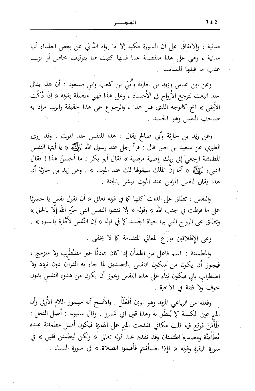 رَوَى الطَّبَرِيُّ عَنْ سَعِيدِ بْنِ جُبَيْرٍ قَالَ: قَرَأَ رَجُلٌ عِنْدَ رَسُولِ اللَّهِ صَلَّى اللهُ عَلَيْهِ وَسَلَّمَ: يَا أَيَّتُهَا النَّفْسُ الْمُطْمَئِنَّةُ ارْجِعِي إِلى رَبِّكِ راضِيَةً مَرْضِيَّةً فَقَالَ أَبُو بَكْرٍ: مَا أَحْسَنَ هَذَا؟ فَقَالَ النَّبِيءُ صَلَّى اللهُ عَلَيْهِ وَسَلَّمَ: «أَمَا إِنَّ الْمَلَكَ سَيَقُولُهَا لَكَ عِنْدَ الْمَوْتِ»