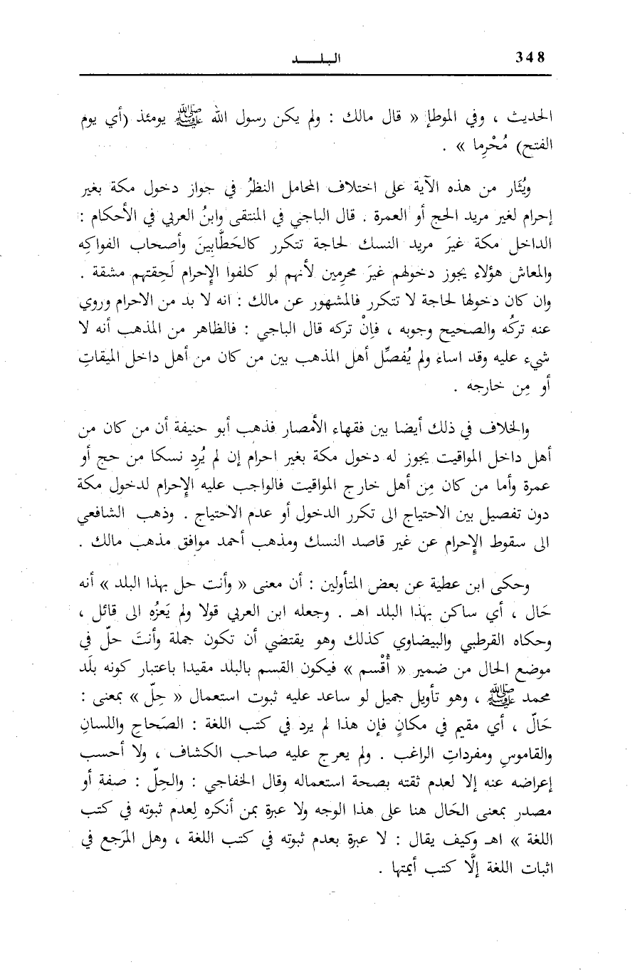 وَيُثَارُ مِنْ هَذِهِ الْآيَةِ عَلَى اخْتِلَافِ الْمَحَامِلِ النَّظَرُ فِي جَوَازِ دُخُولِ مَكَّةَ بِغَيْرِ إِحْرَامٍ لِغَيْرِ مُرِيدِ الْحَجِّ أَوِ الْعُمْرَةِ. قَالَ الْبَاجِيُّ فِي «الْمُنْتَقَى» وَابْنُ الْعَرَبِيِّ فِي «الْأَحْكَامِ» : الدَّاخِلُ مَكَّةَ غَيْرَ مُرِيدِ النُّسُكِ، لِحَاجَةٍ تَتَكَرَّرُ كَالْحَطَّابِينَ وَأَصْحَابِ الْفَوَاكِهِ وَالْمَعَاشِ هَؤُلَاءِ يَجُوزُ دُخُولُهُمْ غَيْرَ مُحْرِمِينَ لِأَنَّهُمْ لَوْ كُلِّفُوا الْإِحْرَامَ لَحِقَتْهُمْ مَشَقَّةٌ. وَإِنْ كَانَ دُخُولُهَا لِحَاجَةٍ لَا تَتَكَرَّرُ فَالْمَشْهُورُ عَنْ مَالِكٍ: أَنَّهُ لَا بُدَّ مِنَ الْإِحْرَامِ، وَرُوِيَ عَنْهُ تَرْكُهُ وَالصَّحِيحُ وُجُوبُهُ، فَإِنْ تَرَكَهُ قَالَ الْبَاجِيُّ: فَالظَّاهِرُ مِنَ الْمَذْهَبِ أَنَّهُ لَا شَيْءَ عَلَيْهِ وَقَدْ أَسَاءَ وَلَمْ يُفَصِّلْ أَهْلُ