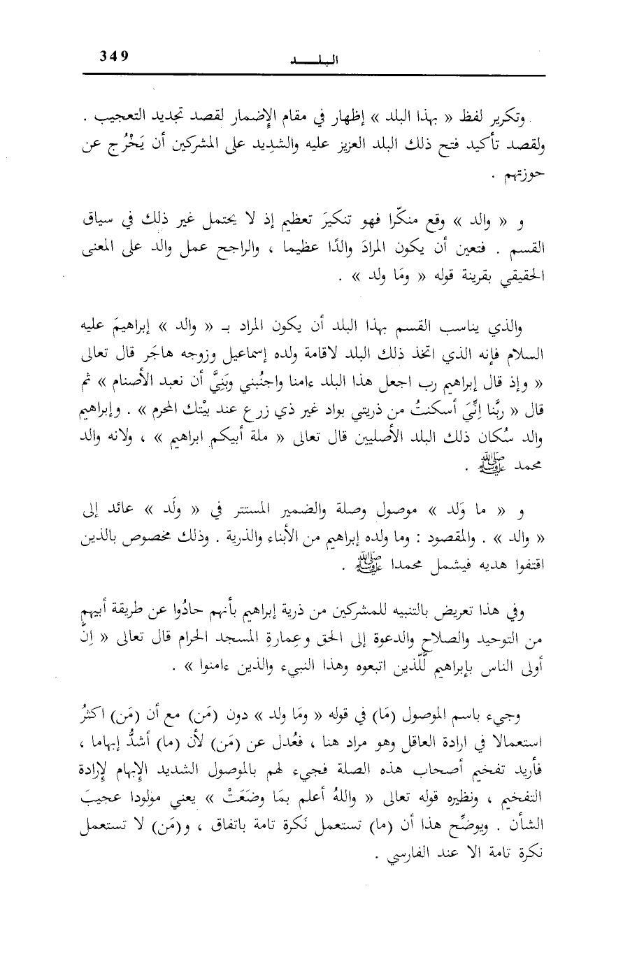 ووالِدٍ وَقَعَ مُنَكَّرًا فَهُوَ تَنْكِيرُ تَعْظِيمٍ إِذْ لَا يَحْتَمِلُ غَيْرَ ذَلِكَ فِي سِيَاقِ الْقَسَمِ. فَتَعَيَّنَ أَنْ يَكُونَ الْمُرَادُ وَالِدًا عَظِيمًا، وَالرَّاجِحُ عَمَلُ وَالِدٍ عَلَى الْمَعْنَى الْحَقِيقِيِّ بِقَرِينَةِ قَوْلِهِ وَما وَلَدَ وَالَّذِي يُنَاسِبُ الْقَسَمَ بِهَذَا الْبَلَدِ أَنْ يَكُونَ الْمُرَادُ بِ والِدٍ إِبْرَاهِيمَ عَلَيْهِ السَّلَامُ فَإِنَّهُ الَّذِي اتَّخَذَ ذَلِكَ الْبَلَدَ لِإِقَامَةِ وَلَدِهِ إِسْمَاعِيلَ وَزَوْجِهِ هَاجَرَ قَالَ تَعَالَى: وَإِذْ قالَ إِبْراهِيمُ رَبِّ اجْعَلْ هَذَا الْبَلَدَ آمِناً وَاجْنُبْنِي وَبَنِيَّ أَنْ نَعْبُدَ الْأَصْنامَ [إِبْرَاهِيم: 35] ثُمَّ قَالَ: رَبَّنا إِنِّي أَسْكَنْتُ مِنْ ذُرِّيَّتِي بِوادٍ غَيْرِ ذِي زَرْعٍ عِنْدَ بَيْتِكَ الْمُحَرَّمِ [إِبْرَاهِيم: 37] . وَإِبْرَاهِيم وَالِدُ سُكَّانِ ذَلِكَ الْبَلَدِ الْأَصْلِيِّينَ قَالَ تَعَالَى: مِلَّةَ أَبِيكُمْ إِبْراهِيمَ [الْحَج: 78] ، وَلِأَنَّهُ وَالِدُ مُحَمَّدٍ صَلَّى اللهُ عَلَيْهِ وَسَلَّمَ.